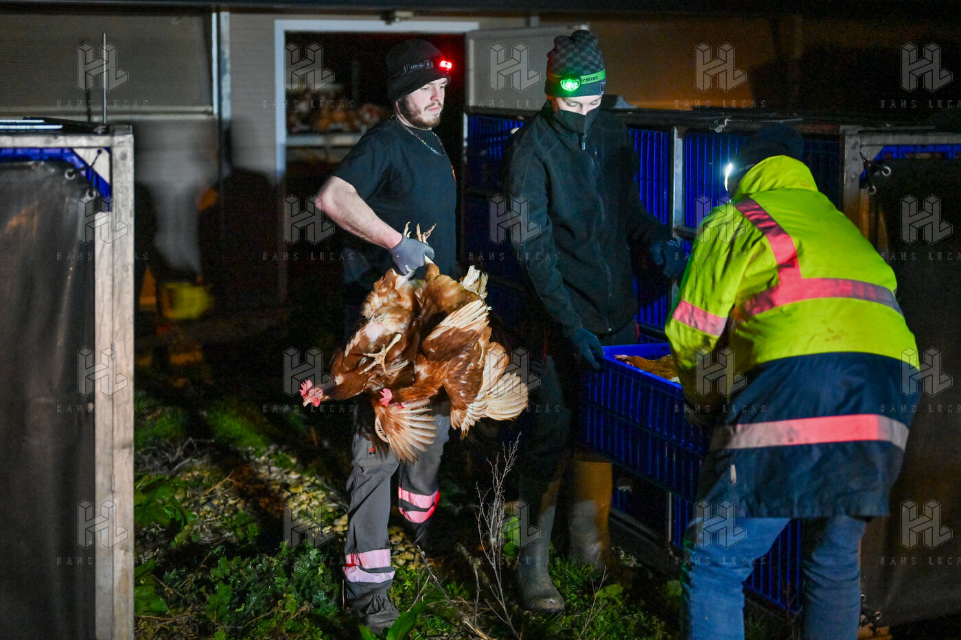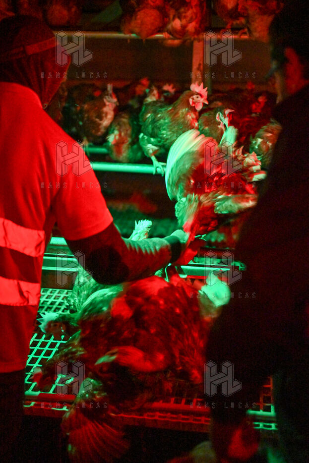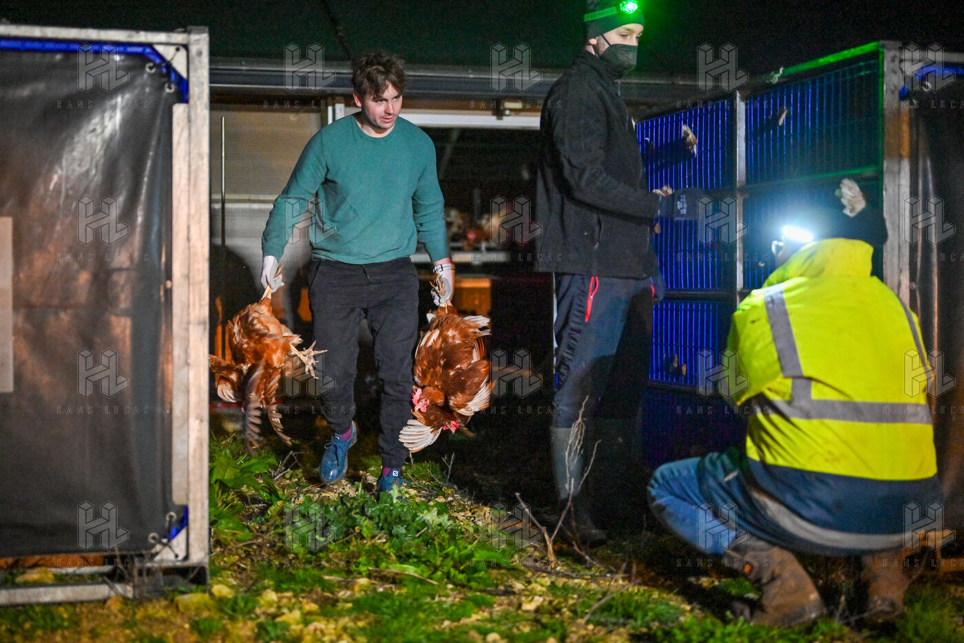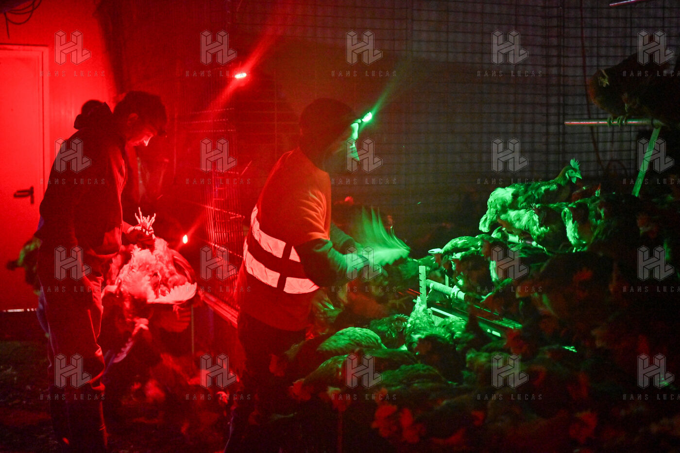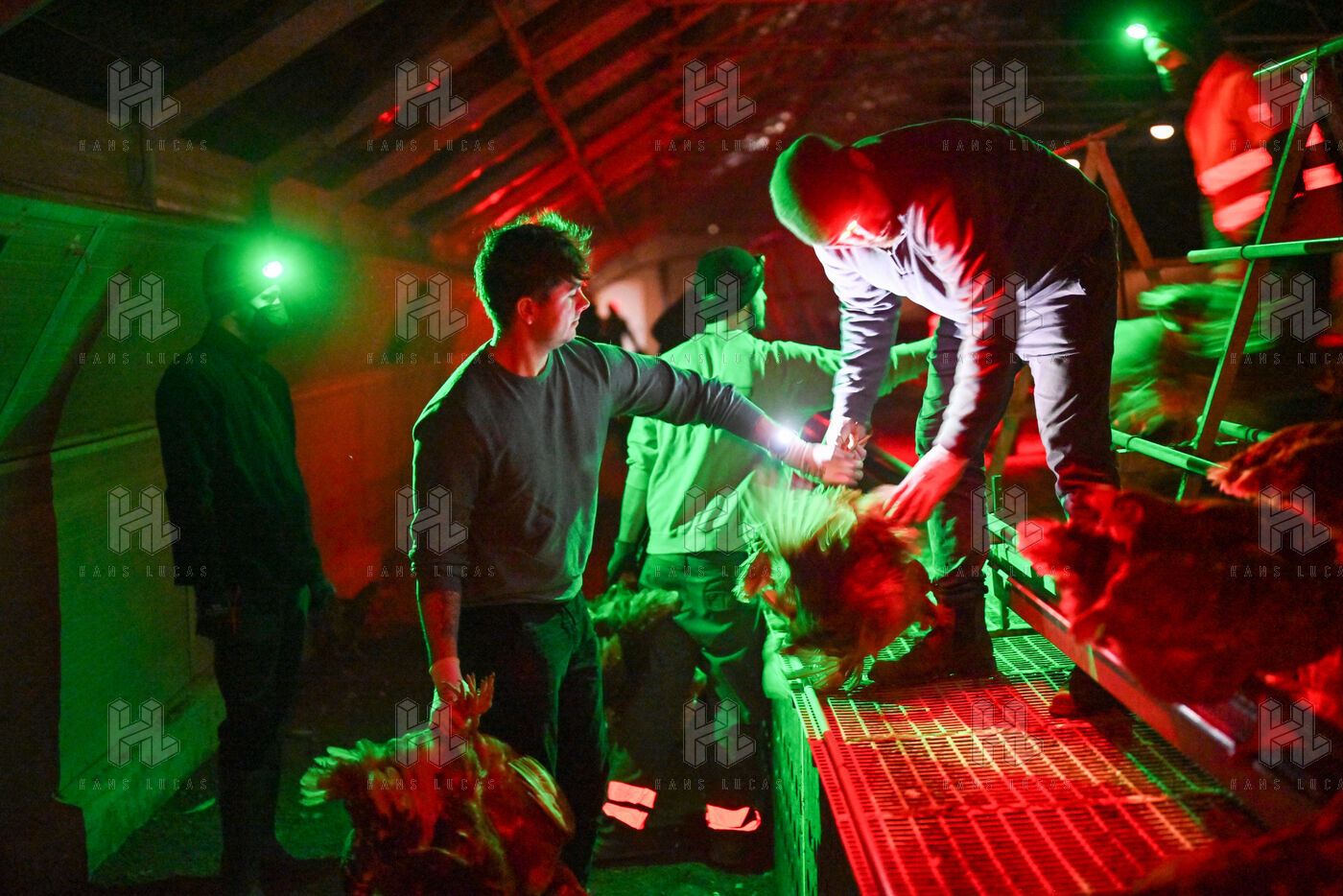 In the heart of the Beauce region, as night falls, this family-owned farm, specializing in the breeding of 9000 laying hens and the production of organic farm products, prepares for a busy evening. Under the red glow of headlamps, poultry gatherers enter the building to begin their collection. The collection team, consisting of 3 seasoned professionals and several friends of the farmer, gets to work. Within two hours, nearly 8000 hens are placed into crates and loaded onto a truck that will head to the slaughterhouse.