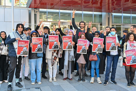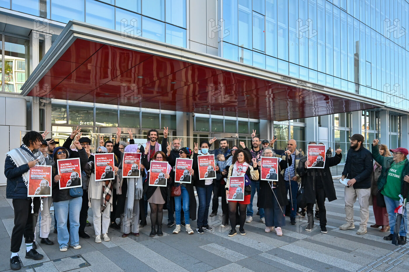 Rassemblement de soutien pour le militant pro-palestinien Elias d'Imzalene, qui comparait ce mercredi 23 octobre devant le tribunal correctionnel de Paris. Ce dernier est poursuivi apres avoir appelle a mener l'intifada a Paris lors d'une manifestation organisee dans la capitale debut septembre.