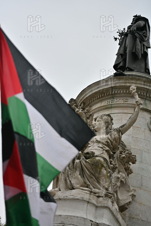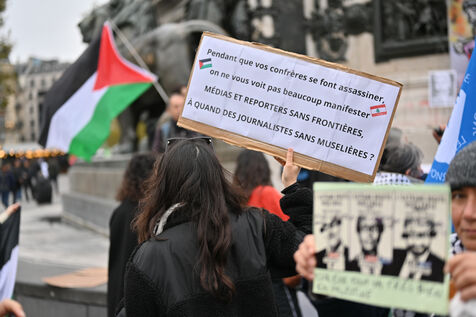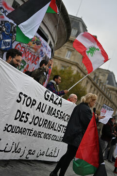 Des centaines de personnes se sont rassemblées cet après-midi sur la place de la République à Paris pour manifester en soutien aux journalistes exerçant leur métier dans des zones de conflit, particulièrement en Palestine et au Liban.