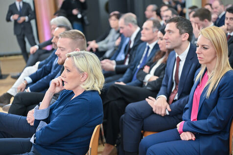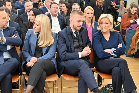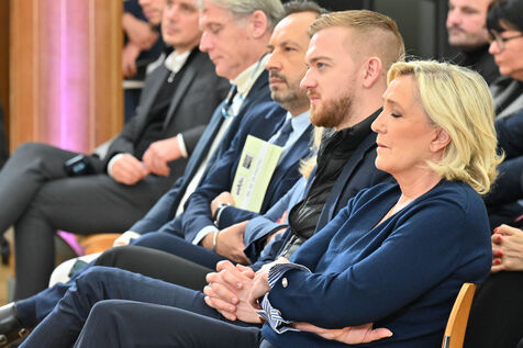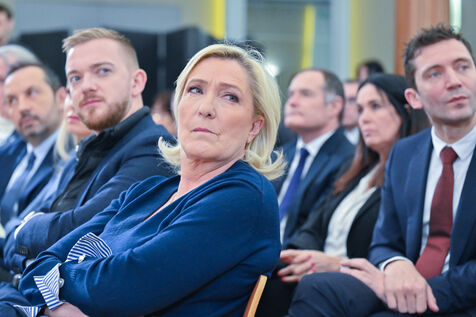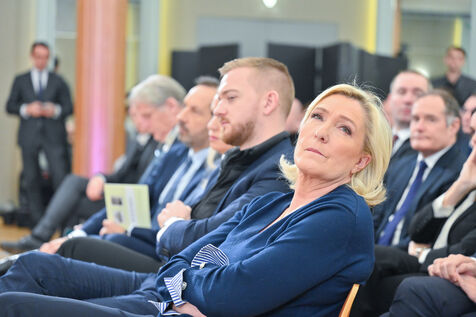 Ceremony of New Year's wishes to the press by RN's Jordan Bardella in the presence of Marine Le Pen at the Maison de la Chimie in Paris.