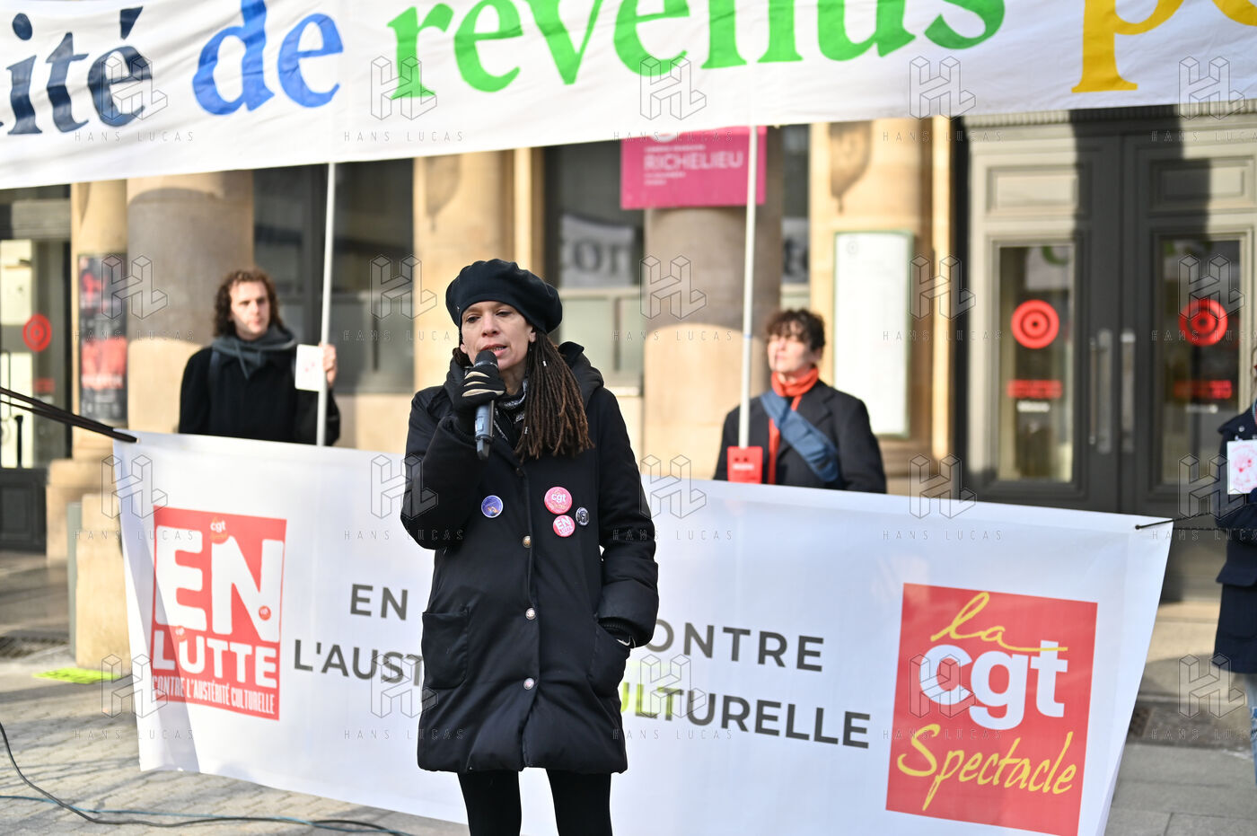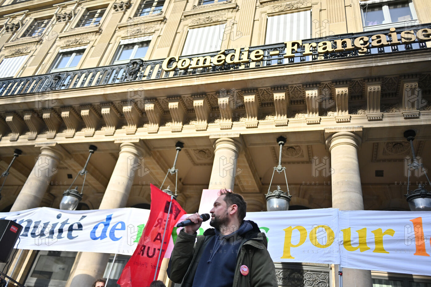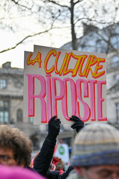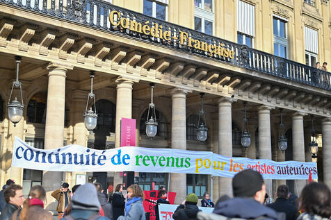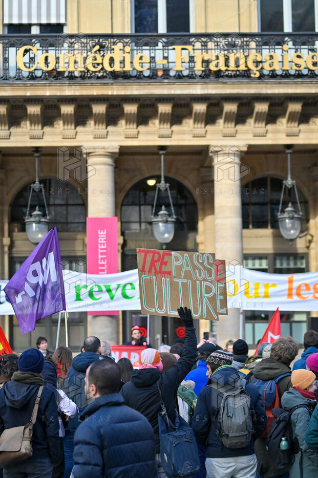 Face aux coupes budgétaires, au désengagement des acteurs publics, a la précarisation des métiers et a l affaiblissement des droits, les travailleur.ses de l art et de la culture se rassemblent place Colette, devant la Comédie Francaise.