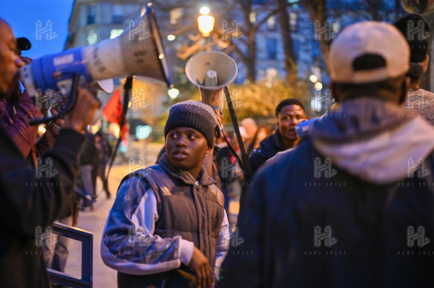 Rassemblement en soutien aux jeunes migrants après la décision de justice imposant leur évacuation de la Gaîté Lyrique. L'équipe du théâtre dénonce une mesure « impensable » qui laisserait plus de 400 personnes sans solution à la rue.