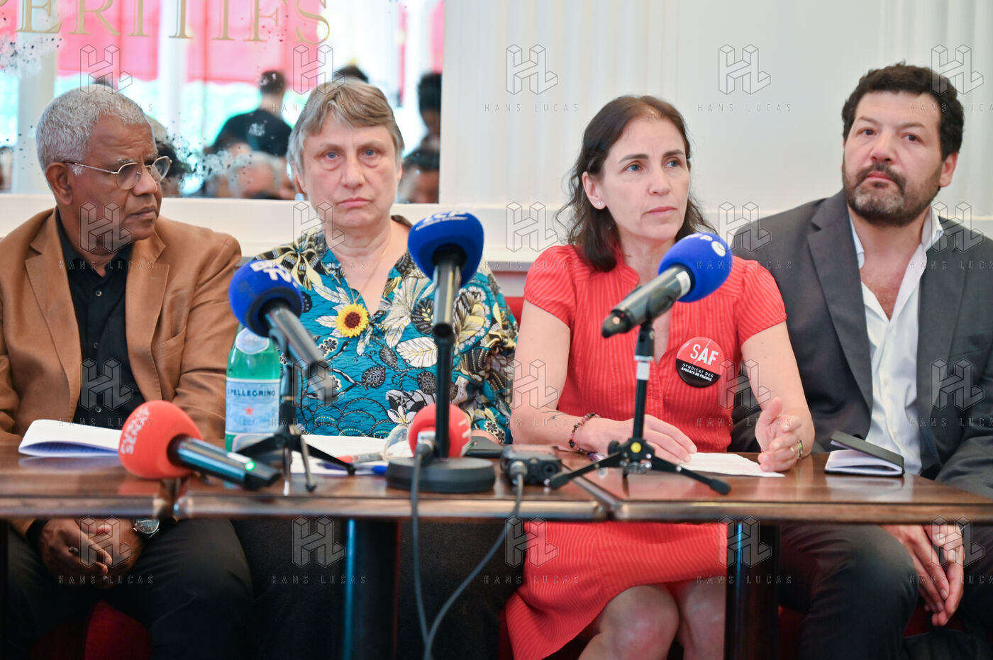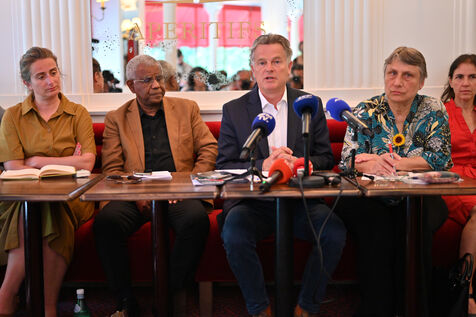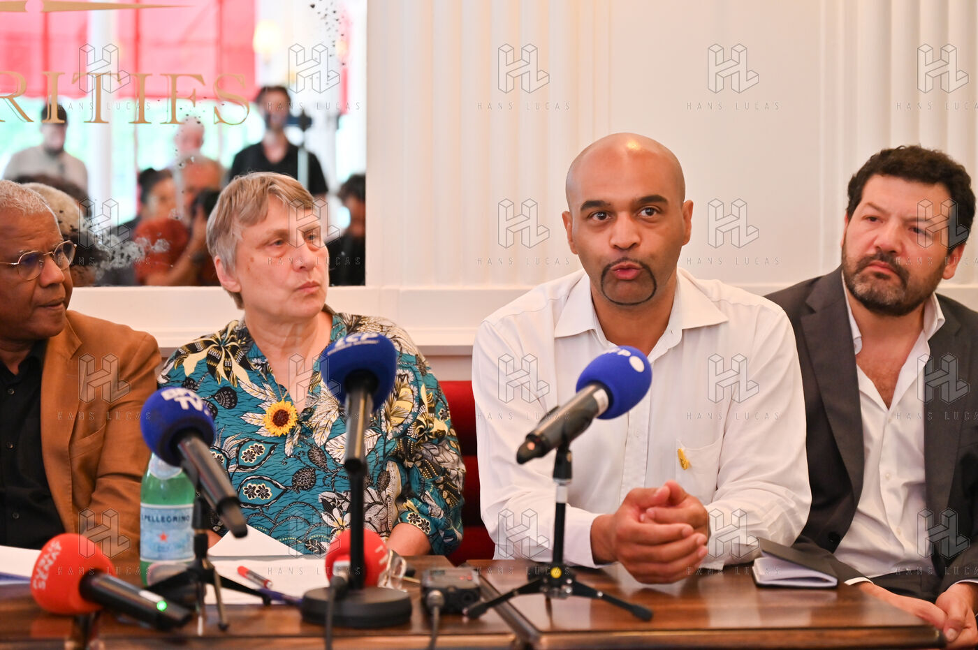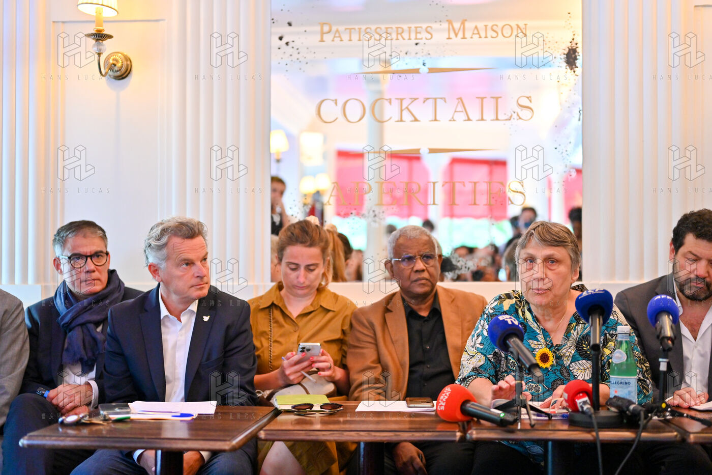 Conférence de presse pour la reconnaissance de l’Etat de Palestine au café Concorde en présence notamment de Marine Tondelier, Olivier Faure et Fabien Roussel.