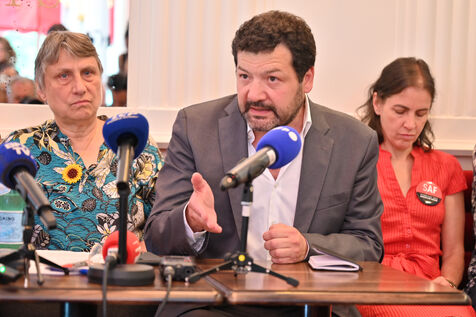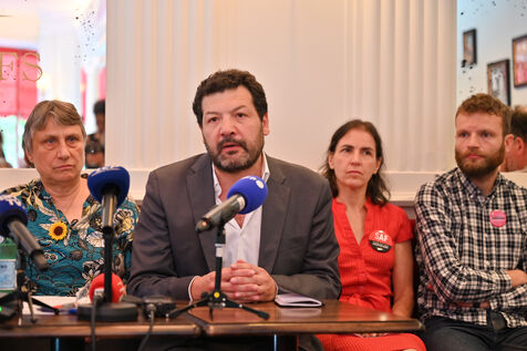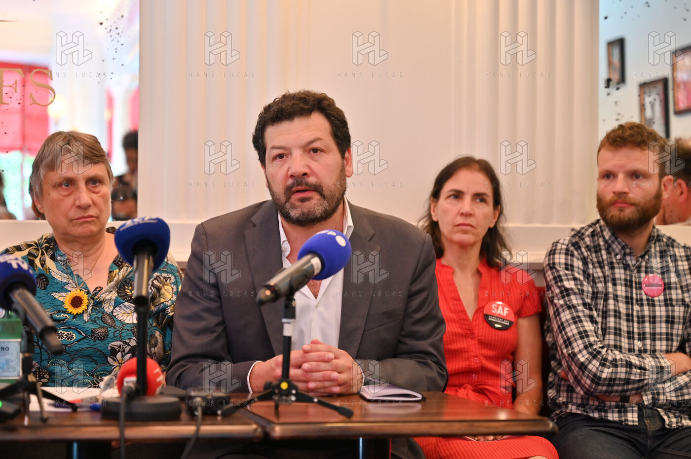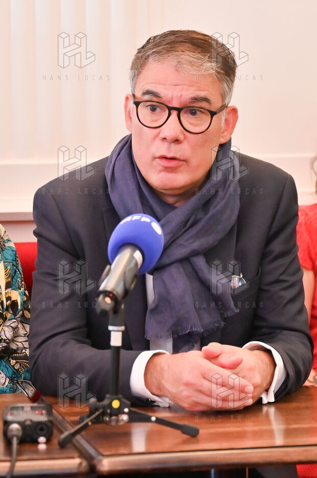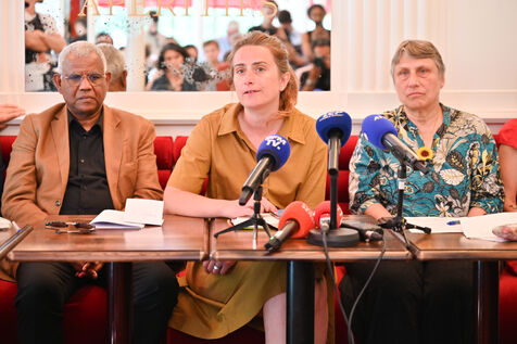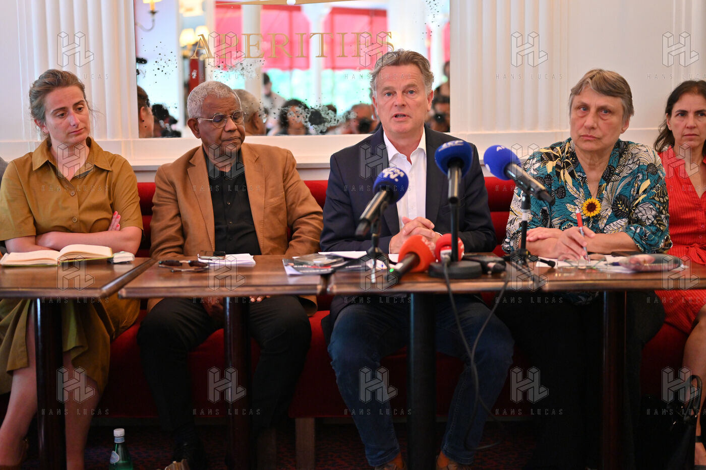 Conférence de presse pour la reconnaissance de l’Etat de Palestine au café Concorde en présence notamment de Marine Tondelier, Olivier Faure et Fabien Roussel.