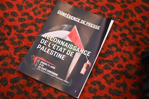 Press conference for the recognition of the State of Palestine at the Concorde café, notably attended by Marine Tondelier, Olivier Faure, and Fabien Roussel.