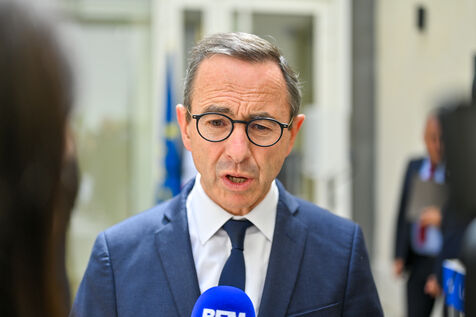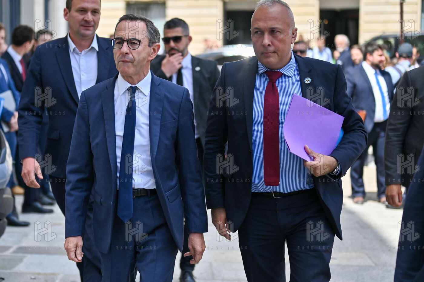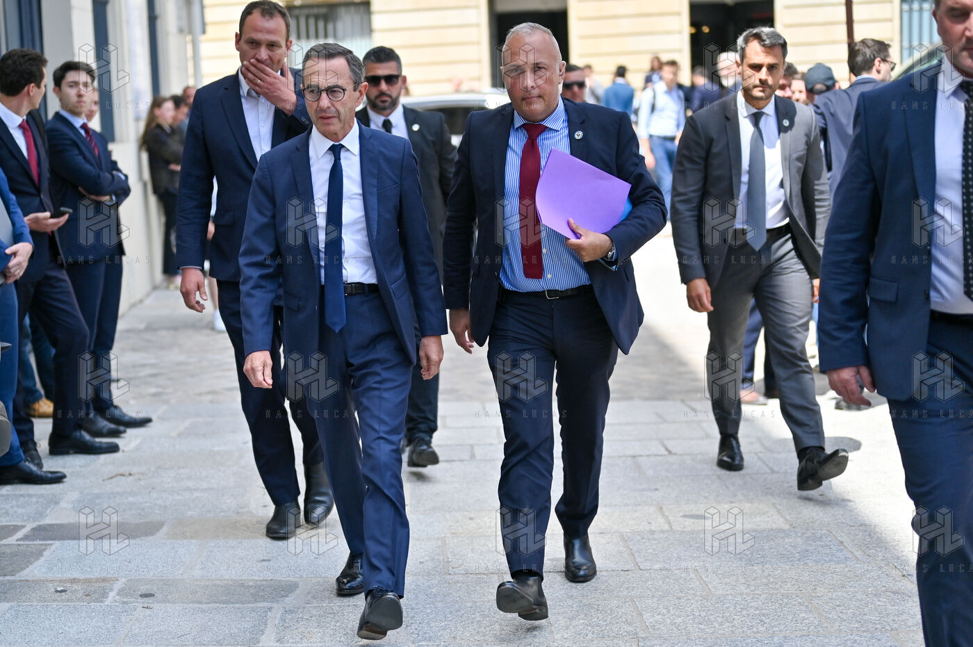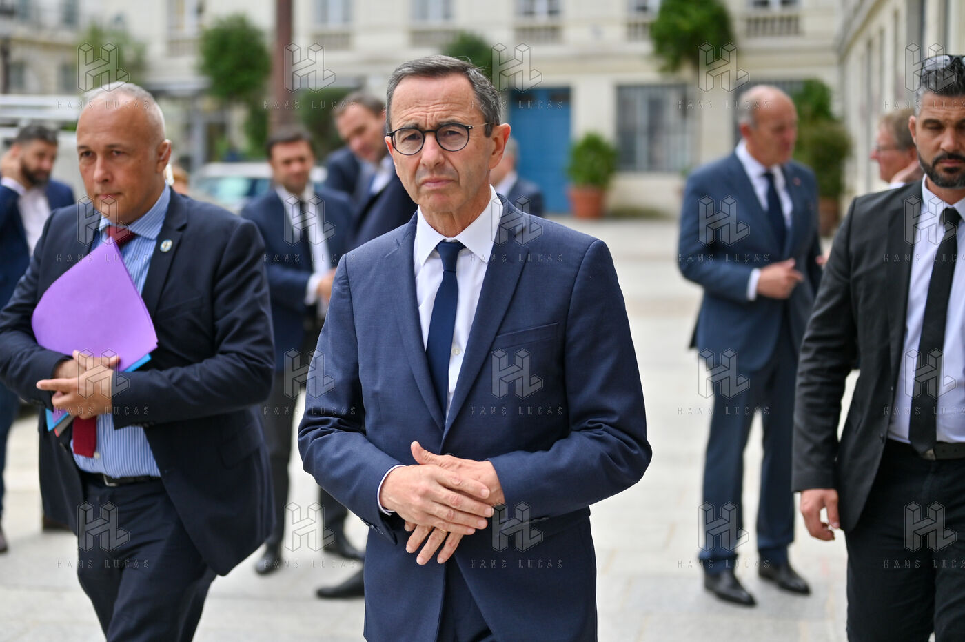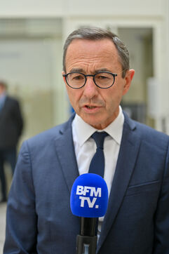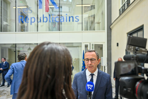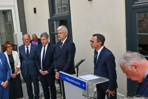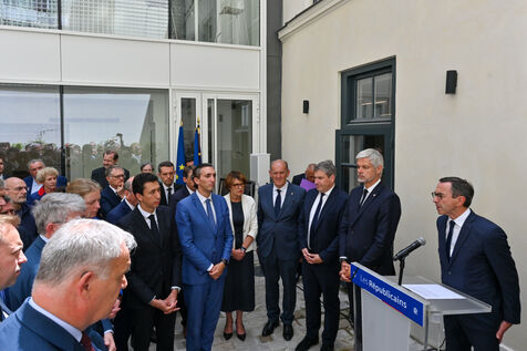 Bruno Retailleau et des membres des Républicains rendent hommage à Olivier Marleix au siege du parti LR.