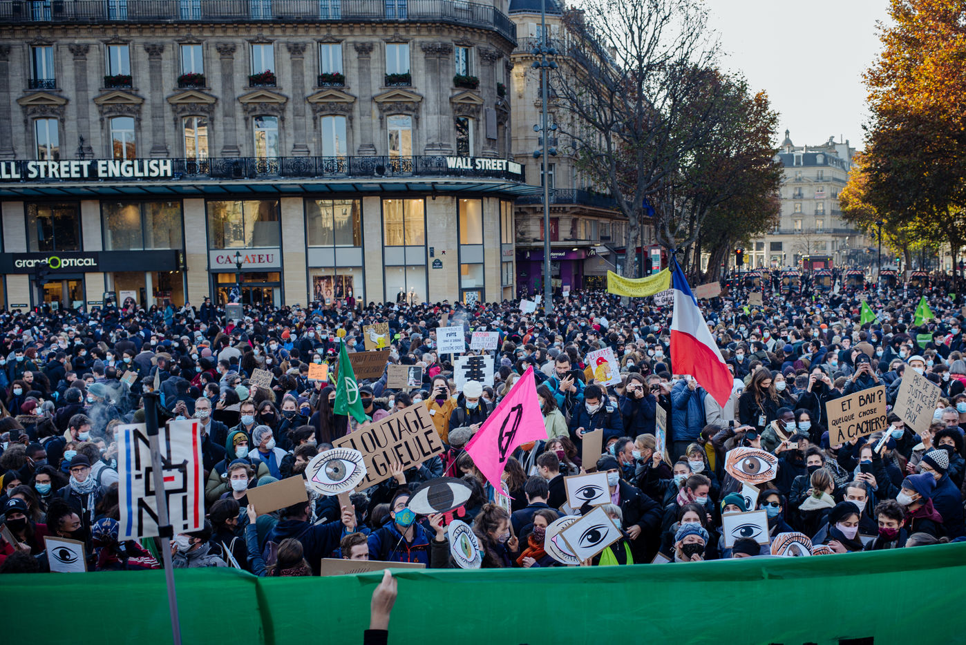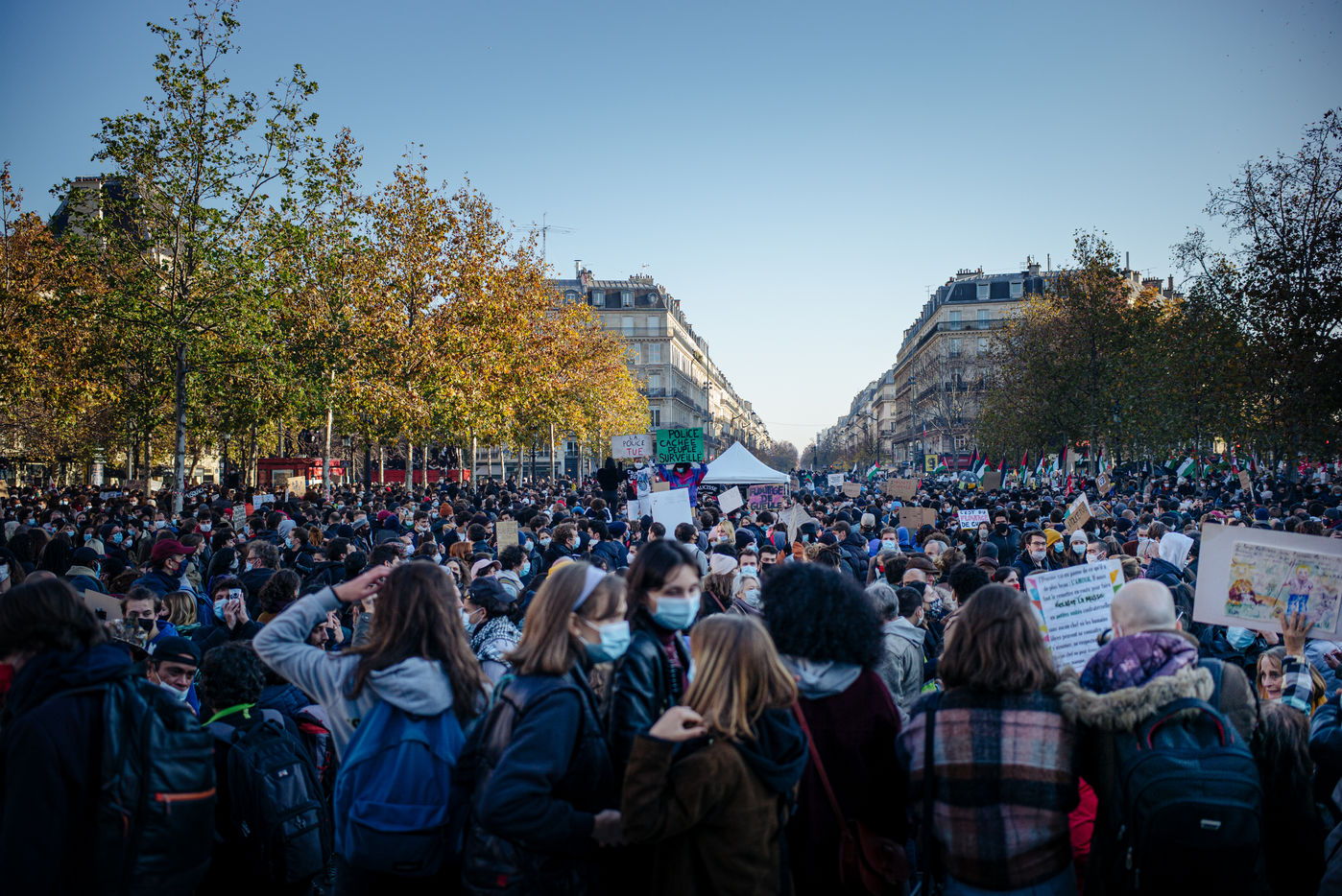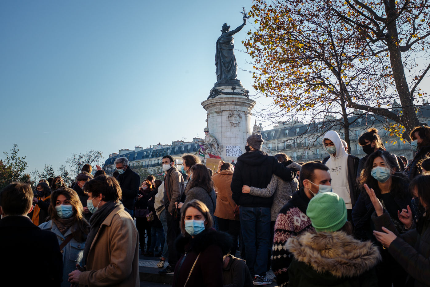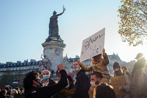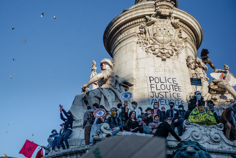 Paris, November 28, 2020. The March of Liberties against the "global security" law is organized between Place de République and Place de la Bastille to denounce the proposed "global security" law, especially article 24 prohibiting any person from disseminating "the image of the face or any other element of identification of a police officer" and to denounce police violence.