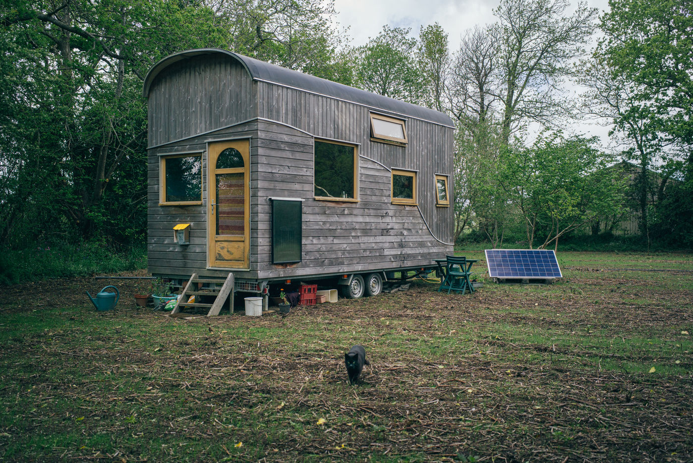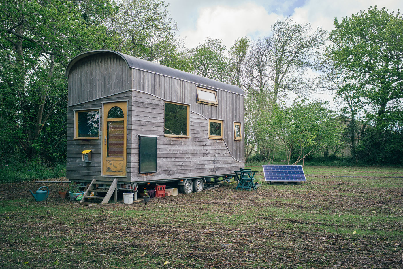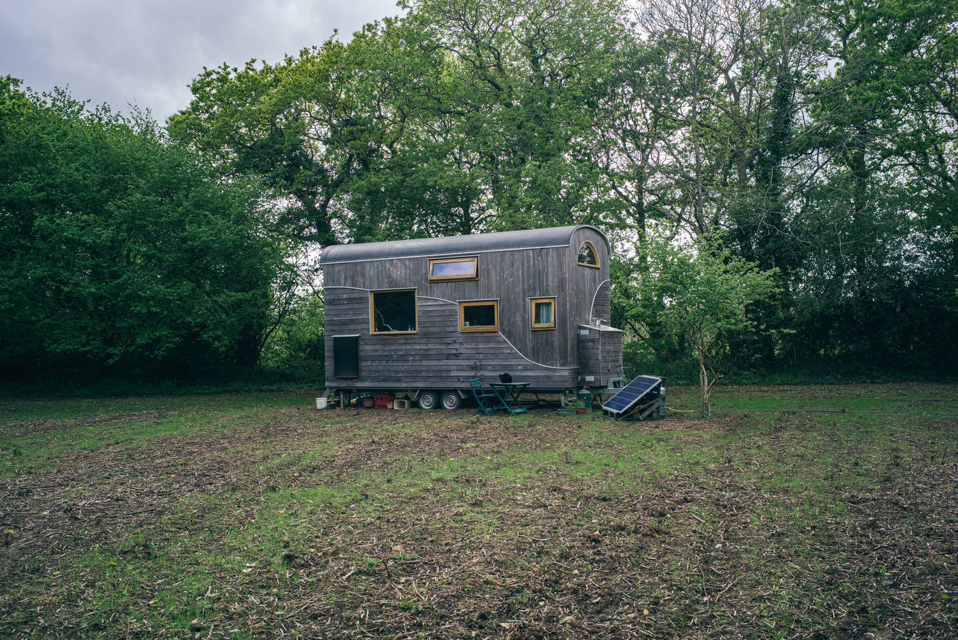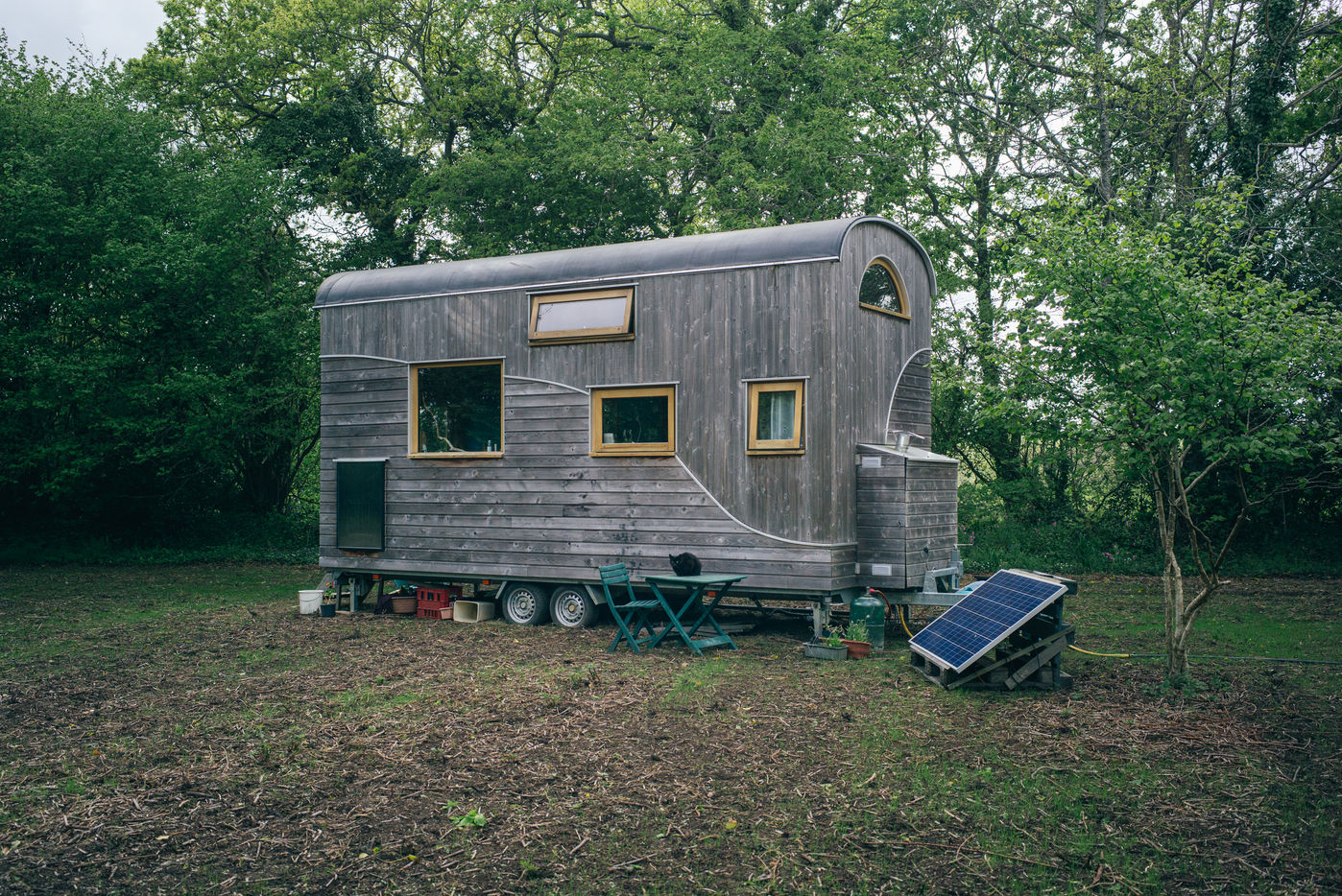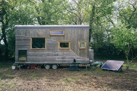 Illustration d une tiny house. En plein champs, une tiny house est posee, ce type d habitation alternatif et nomade a de plus en plus de succes.