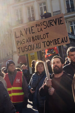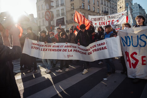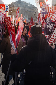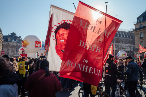 2023, 07, February, Paris (75), FRANCE. Day of mobilisation, strikes and demonstrations to challenge the pension reform planned by Prime Minister Elisa-beth Borne.