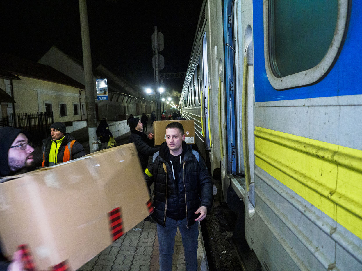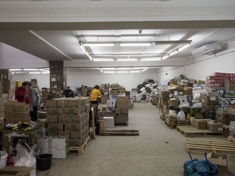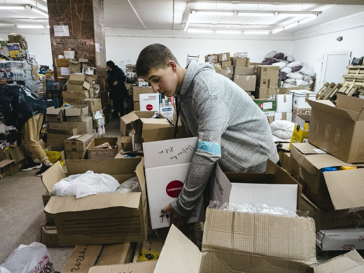 Lviv, Ukraine March 2022. The largest city in Western Ukraine is preparing for war, the whole city is in a state of emergency. The inhabitants begin to hear the sirens of the city to warn of a possible bombardment, even if, for the moment, no bomb has yet pierced the sky of this city of art. In the center, in the old town, the art center was requisitioned by the city to organize a vast humanitarian center run by volunteers. A veritable anthill is active 24 hours a day, every day. : women, men, young people, old people... They started by receiving donations in order to dispatch them to nearby regions, then gradually grew thanks to the influx of European aid to supply the whole country.