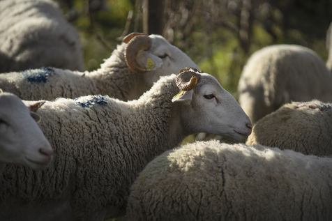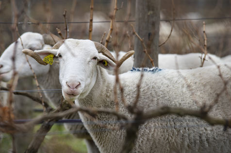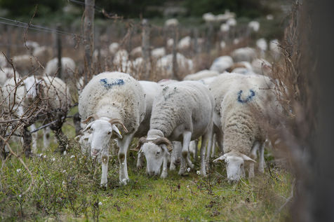 Des moutons paturent dans les rangées de vignes dans la Clape (11) le 21 Janvier 2019.