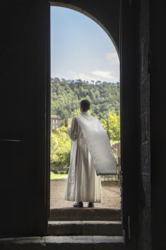 Chez les chanoines de l'Abbaye de Lagrasse dans les Corbières. Monastère bénédictin du VIIIe siècle au XVIIIe siècle, l'abbaye est vendue comme bien national à la Révolution française et coupée en deux lots.