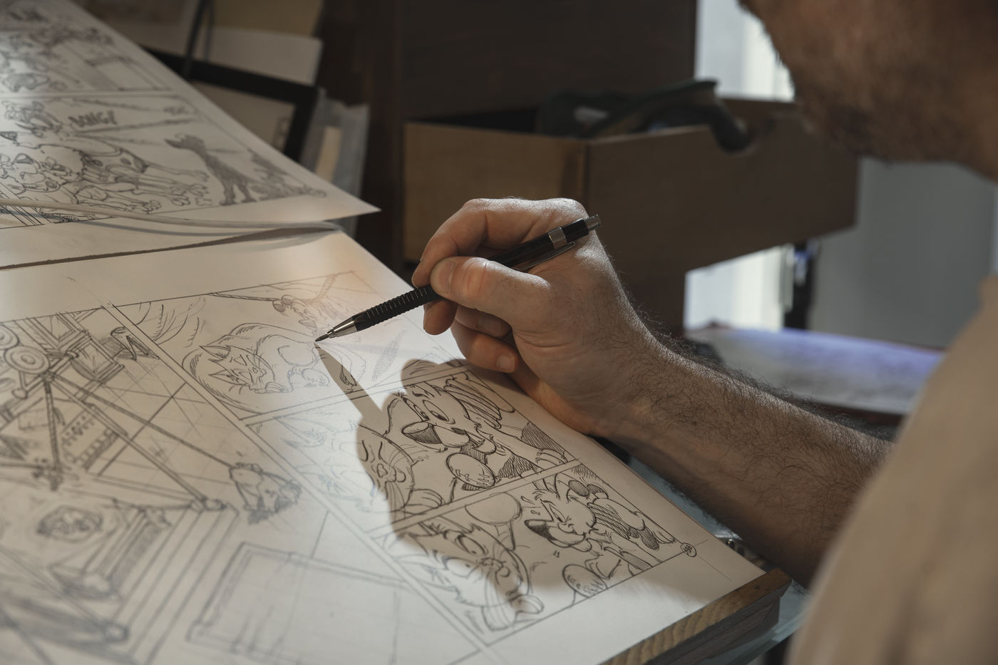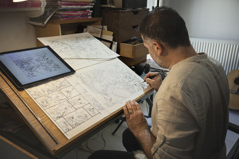 Dans l'atelier du dessinateur de bande dessinée (BD) Philippe Fenech, auteur des dessins de l'album "Idéfix et les Irréductibles" ou encore la serie "Mes Cop's".