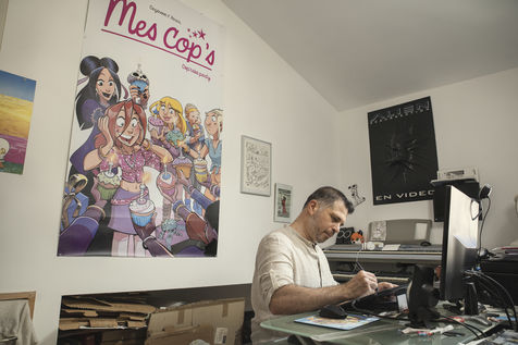 In the studio of comic strip artist Philippe Fenech, author of the drawings for the album "Idéfix et les Inréductibles" or the series "Mes Cop's".