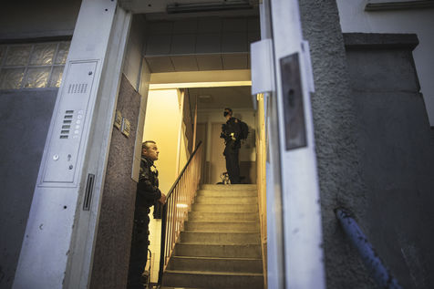 Des gendarmes investissent différents halles d'immeubles dans une cite HLM de la ville de Trèbes dans l'Aude à la recherche de drogues dans une enquête pour trafic de stupefiants.