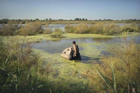 Reportage avec des ornithologues lors de la pose de balises GPS sur des oiseaux proteges dans la réserve naturelle du Scamandre dans le Gard, dans le cadre du projet Migralion qui permet de mesurer le flux migratoire de la faune volante au dessus de la mer méditerannée et l'impact dans le développement de projets éoliens offshore.