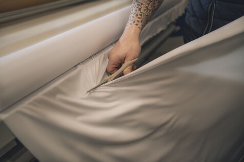 Dans les locaux de l'entreprise de textile LCS (La Crémerie Sérigraphie) fabriquant de la marque de vêtement le Maillot Francais labellisé "Origine France Garantie".