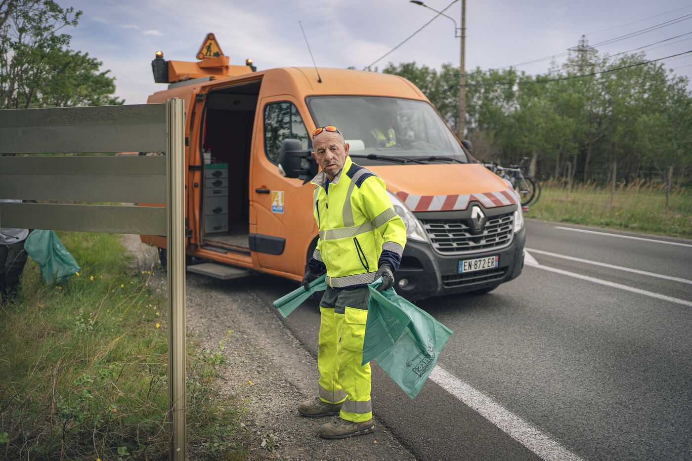 Opération nettoyage par la collecte de déchets sur le bord de la route part des bénévoles et le service des routes sur la départementale D6009 à Fitou dans l'Aude.