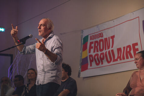 Philippe Poutou, candidate for the legislative elections, during a meeting in Carcassonne, France, June 18, 2024. Philippe Poutou, spokesperson for the New Anticapitalist Party (NPA) is a candidate for the New Popular Front (NFP) in the first constituency of the Auda.