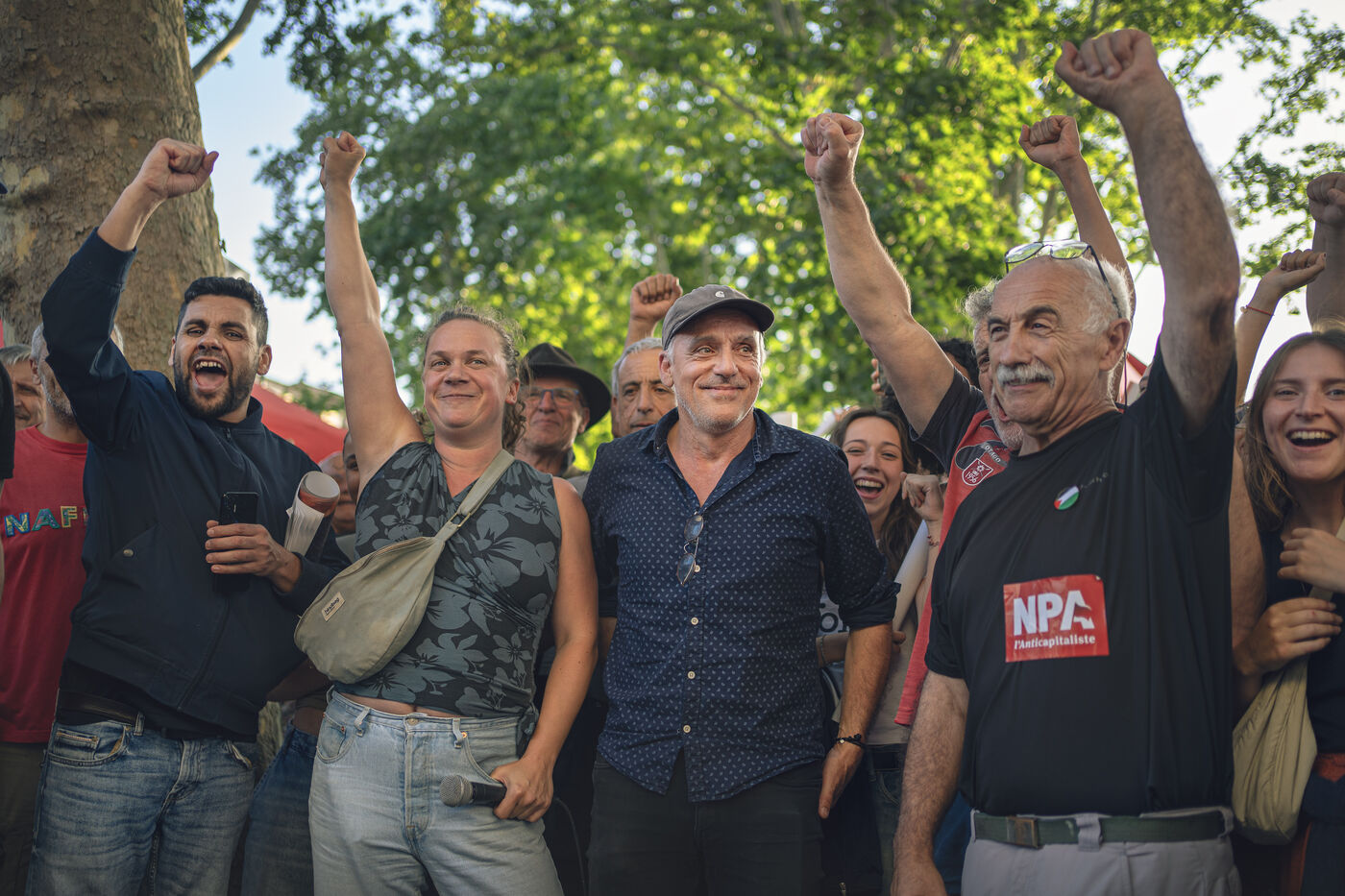 Philippe Poutou, candidat aux élections législatives, lors d'un meeting à Carcassonne, France, le 18 juin 2024. Philippe Poutou, porte parole du Nouveau Parti Anticapitaliste (NPA) est candidat pour le Nouveau Front Populaire (NFP) dans la première circonscription de l'Aude.