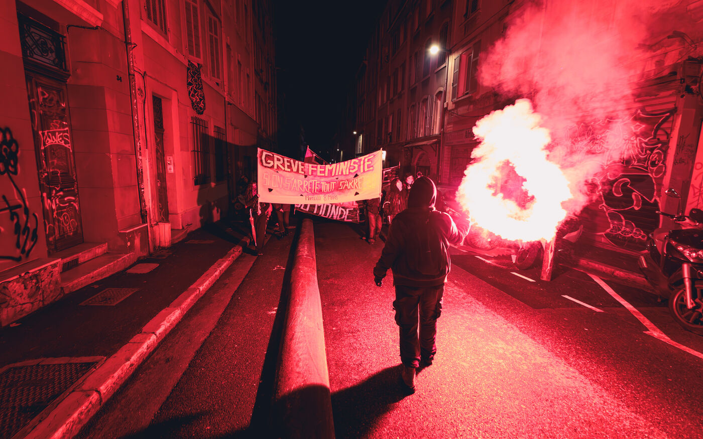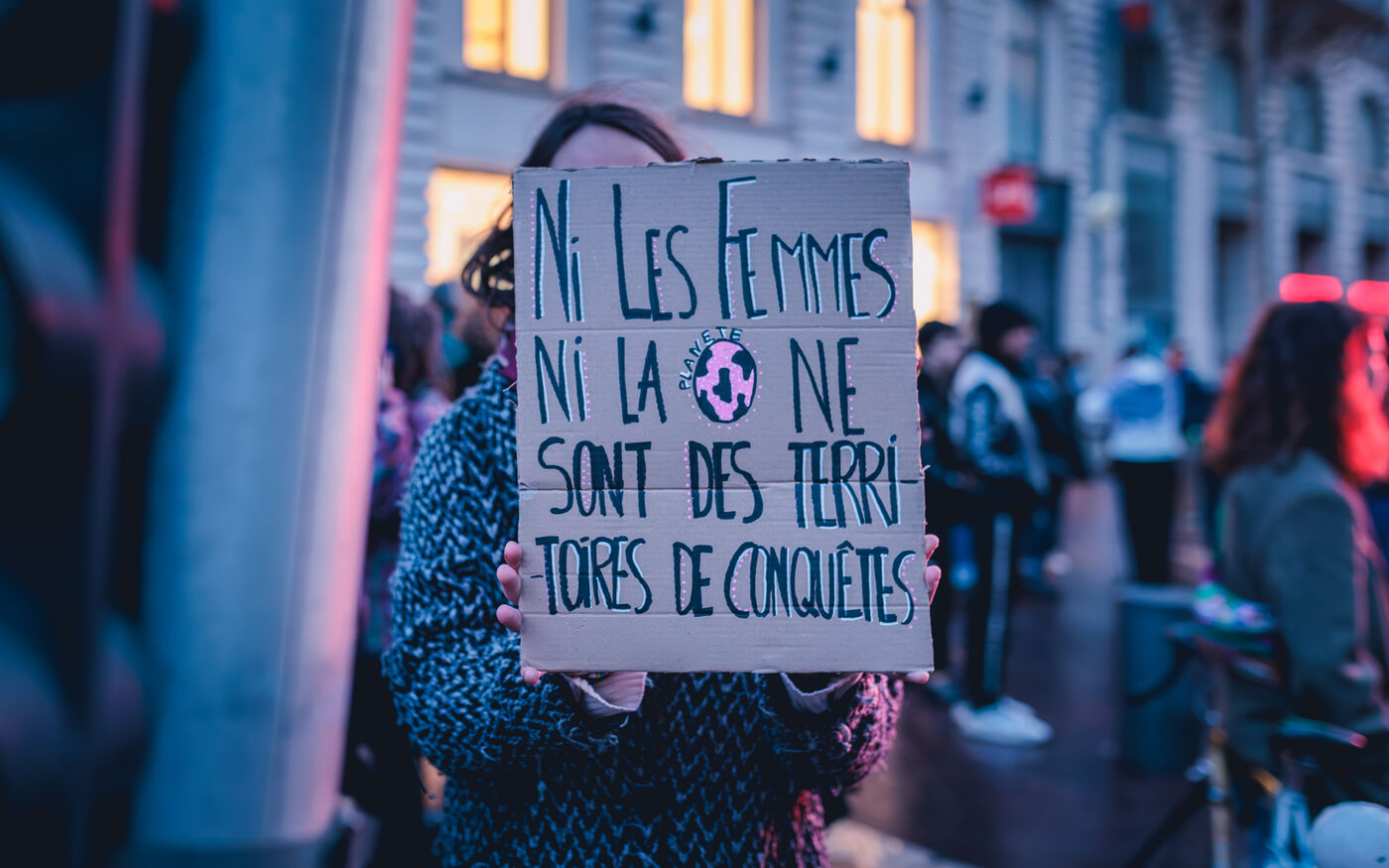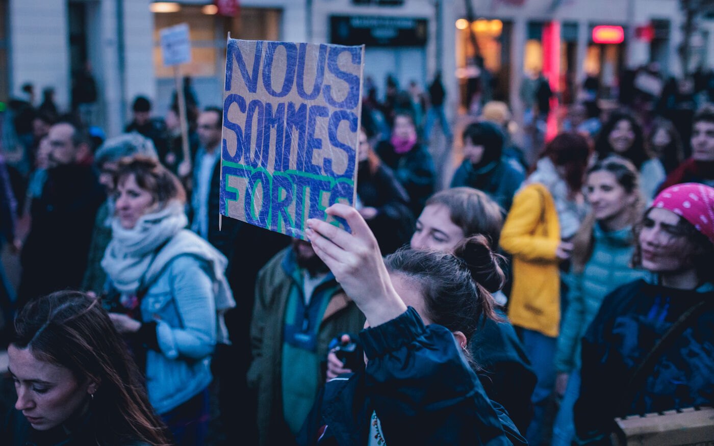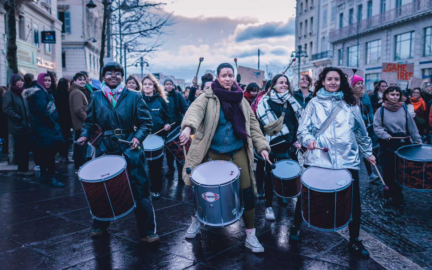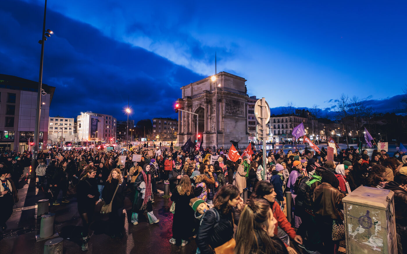 La manifestation met en lumiere les luttes pour l’egalite des genres et les droits des femmes et repond a un appel national a la greve feministe pour denoncer les violences sexistes et les inegalites salariales.