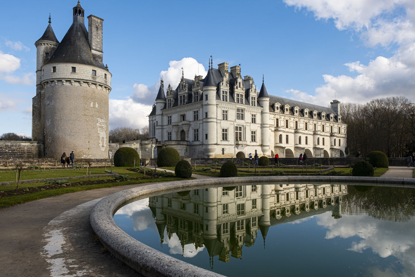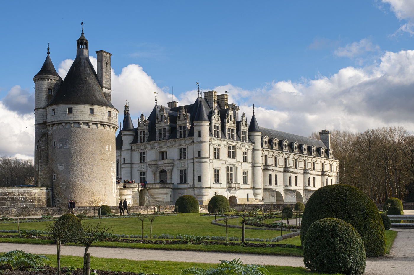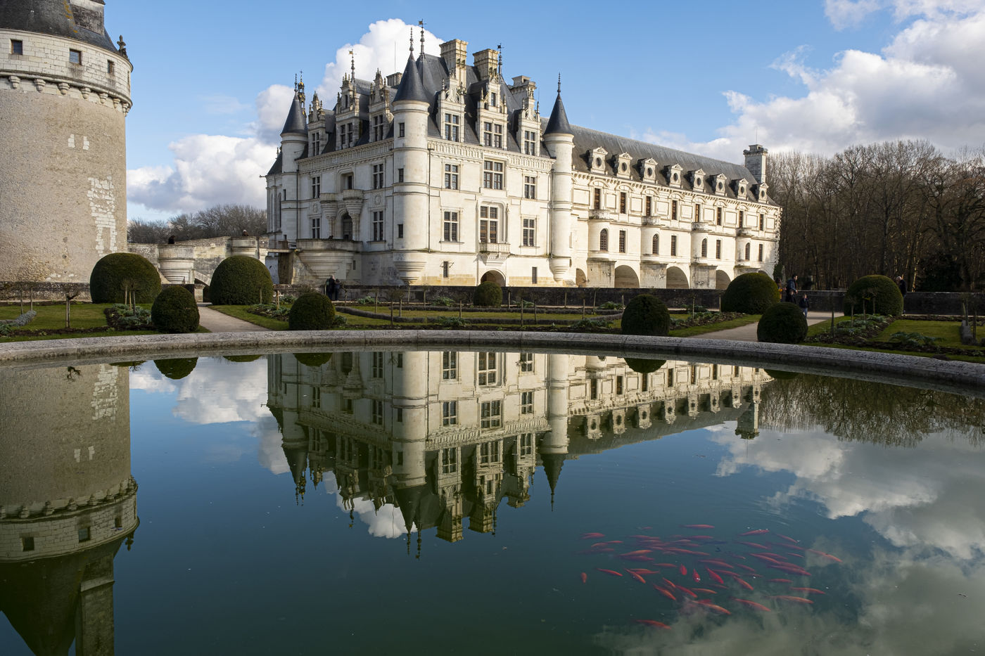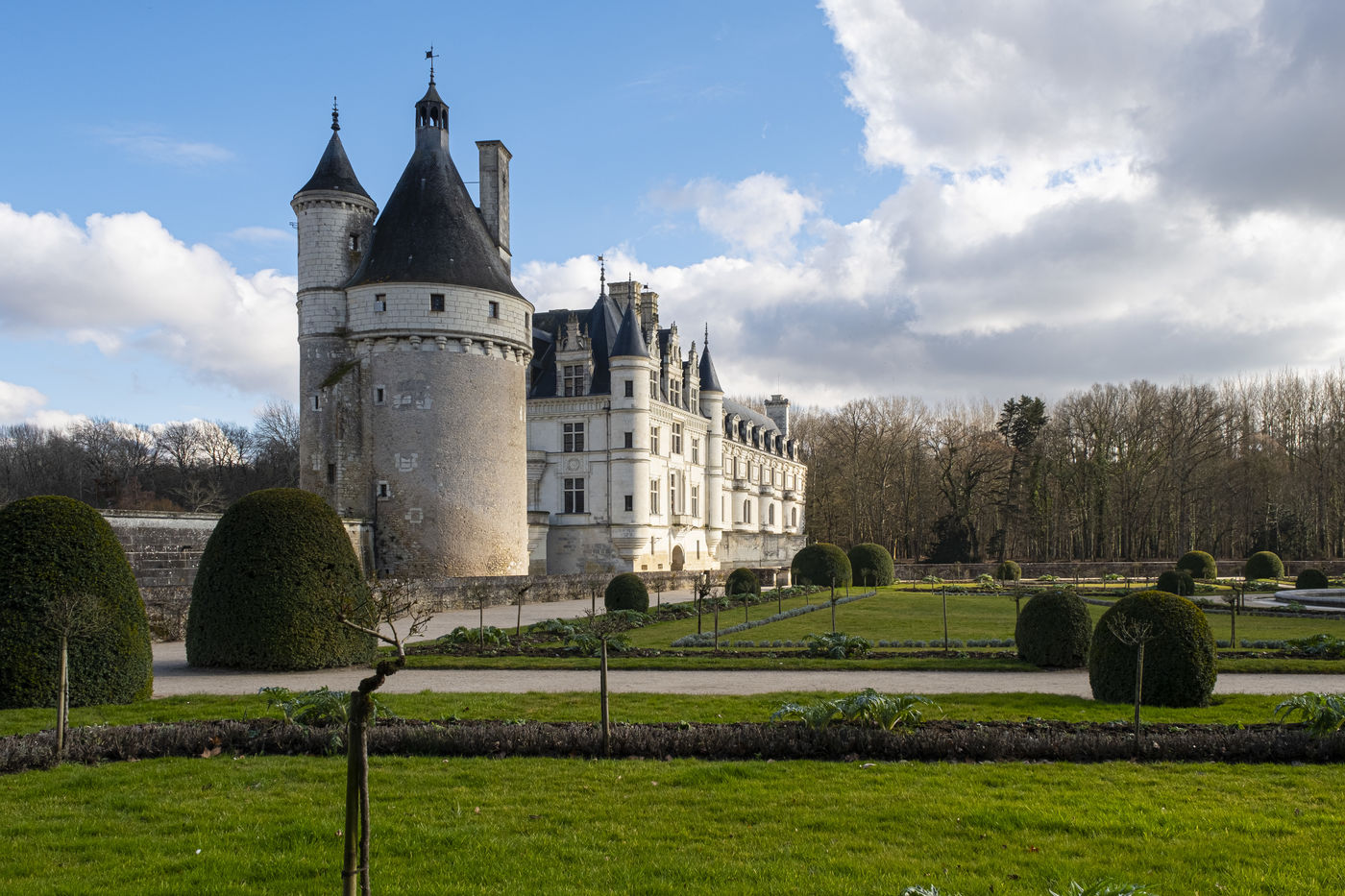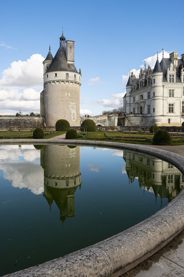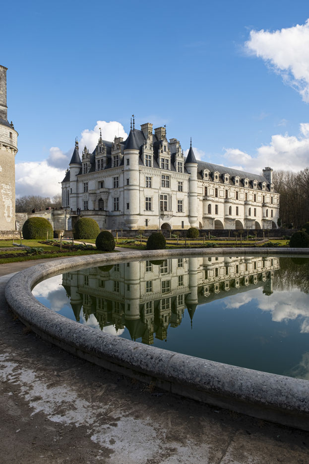 Vues du Château de Chenonceau, château de la Loire sur le Cher , de son jardin et de son parc en hiver .