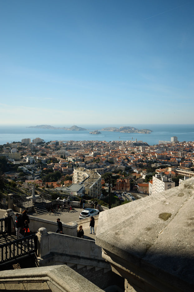 France, Marseille, 2022-01-12. A panoramic view of Marseille from Notre-Dame de la Garde basilica.. Photography by Iselyne Perez-Kovacs / Hans Lucas.