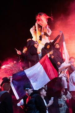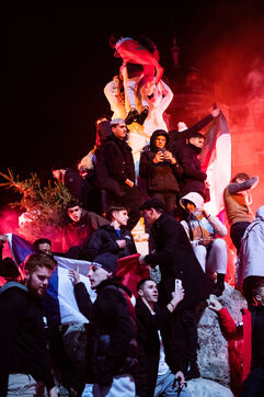 France, Montpellier, 2022-12-10. Fans celebrate the victory of France and Morocco in the quarter-finals at the Place de la Comedie. Photography by Iselyne Perez-Kovacs / Hans Lucas.