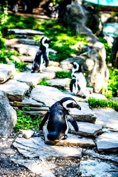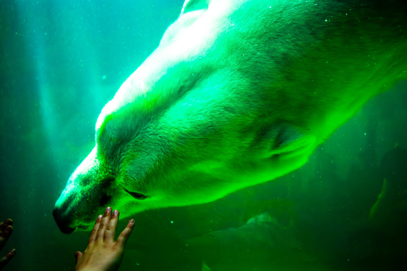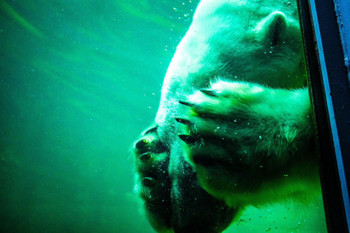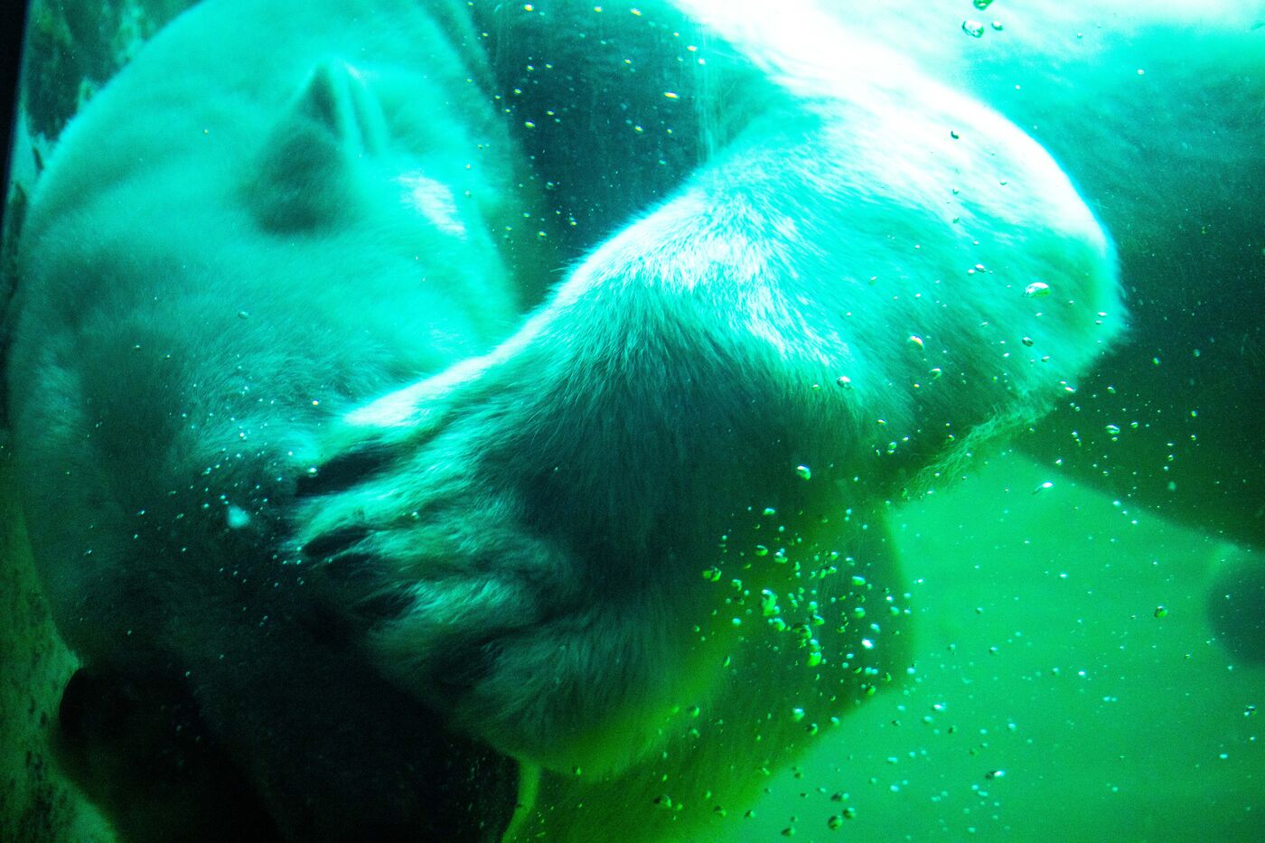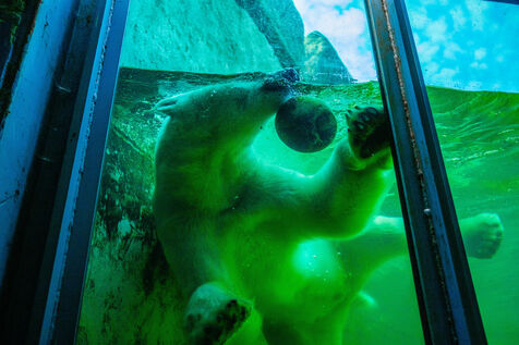 Hungary, Budapest, 2023-07-17. A polar bear, a penguin and a seal in captivity at Budapest Zoo. Photography by Iselyne Perez-Kovacs / Hans Lucas.