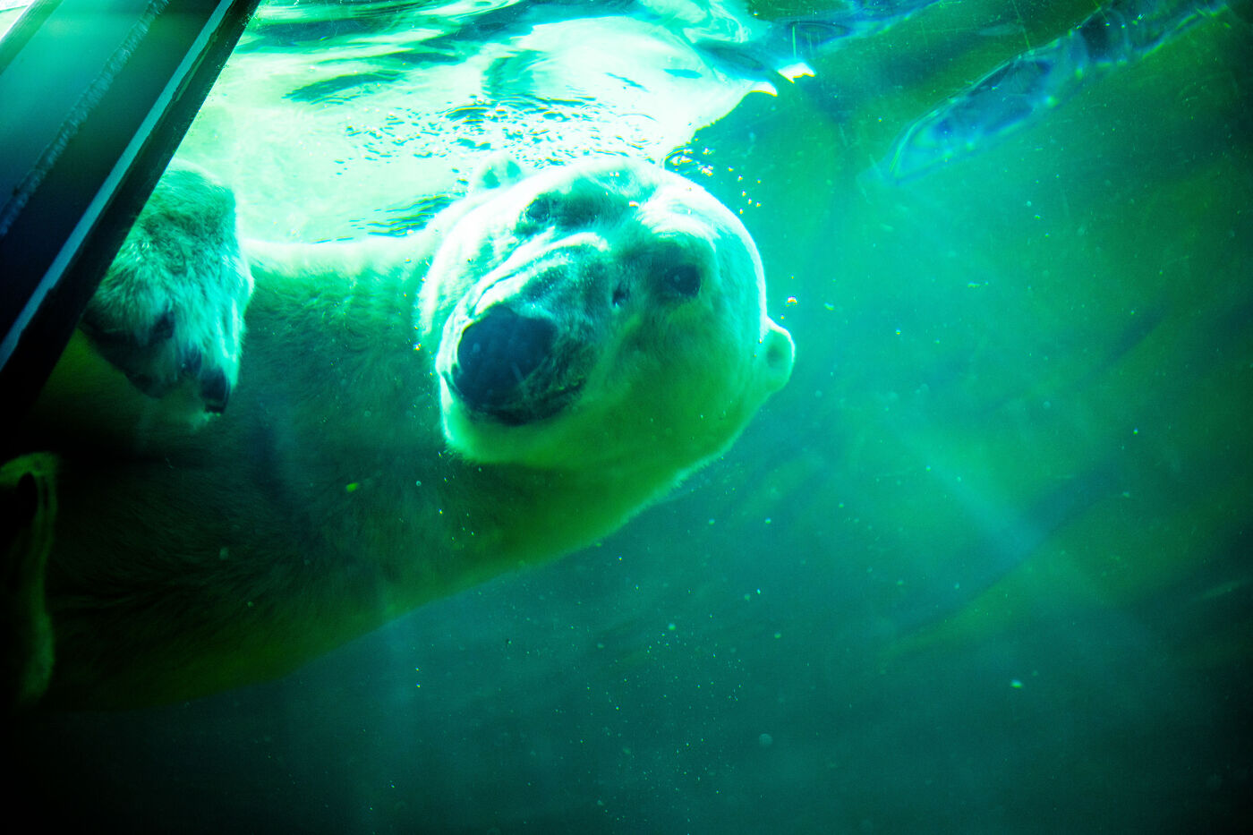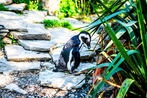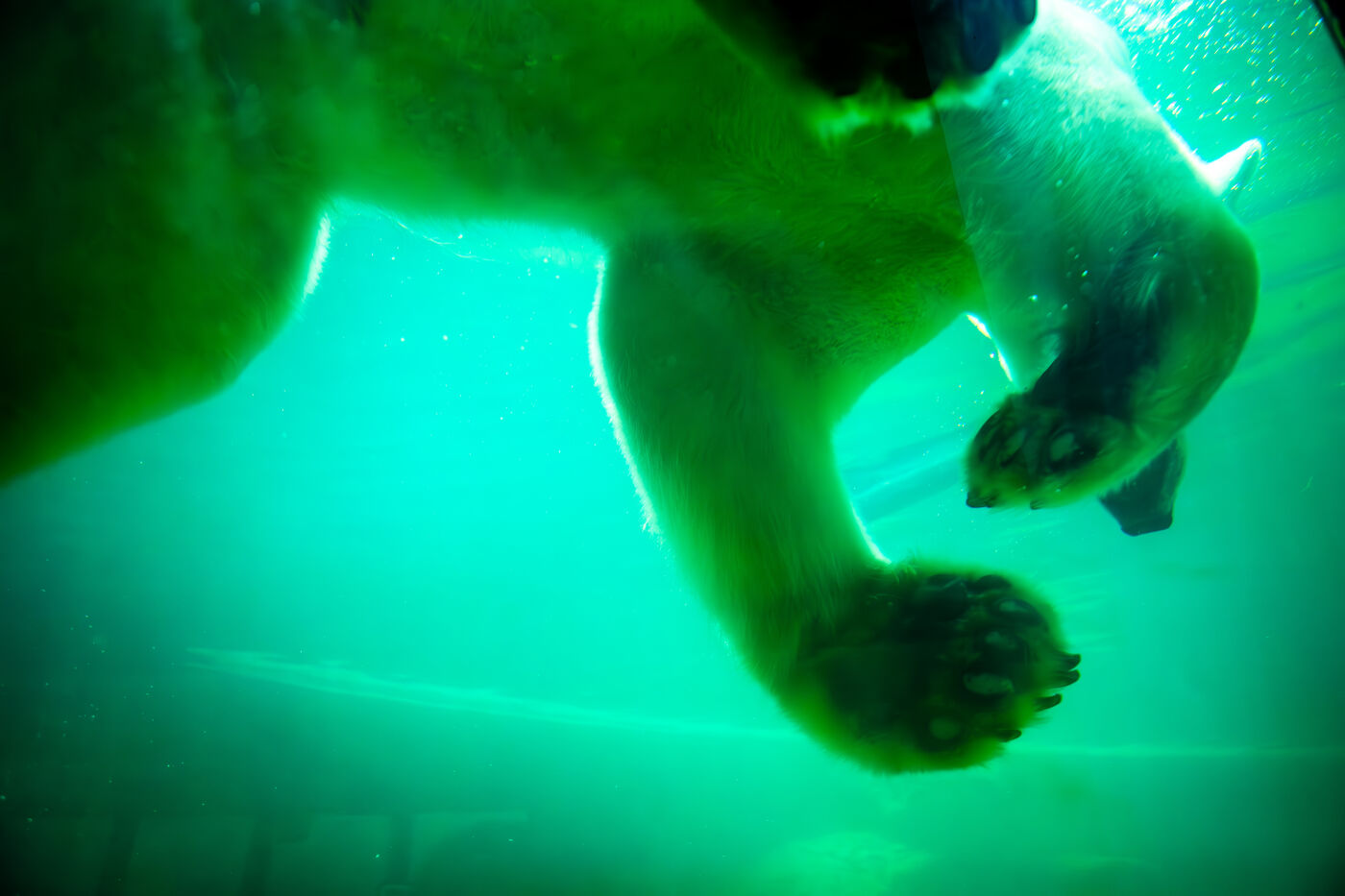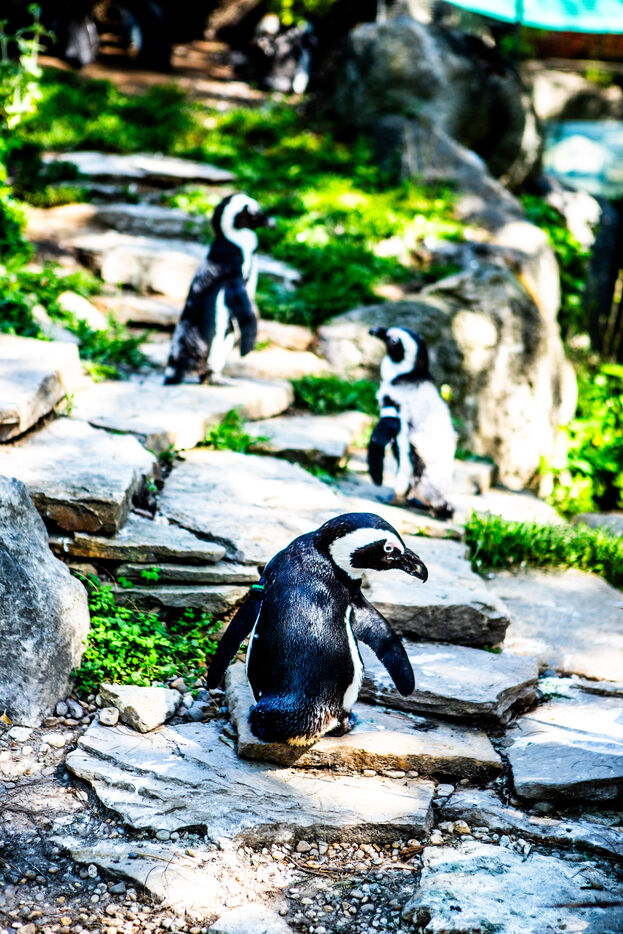 Hongrie, Budapest, 2023-07-17. Un ours polaire, des manchots et un phoque en captivité au zoo de Budapest. Photographie par Iselyne Perez-Kovacs / Hans Lucas.