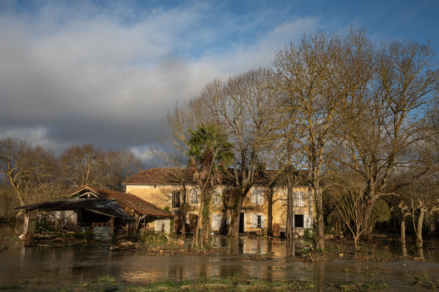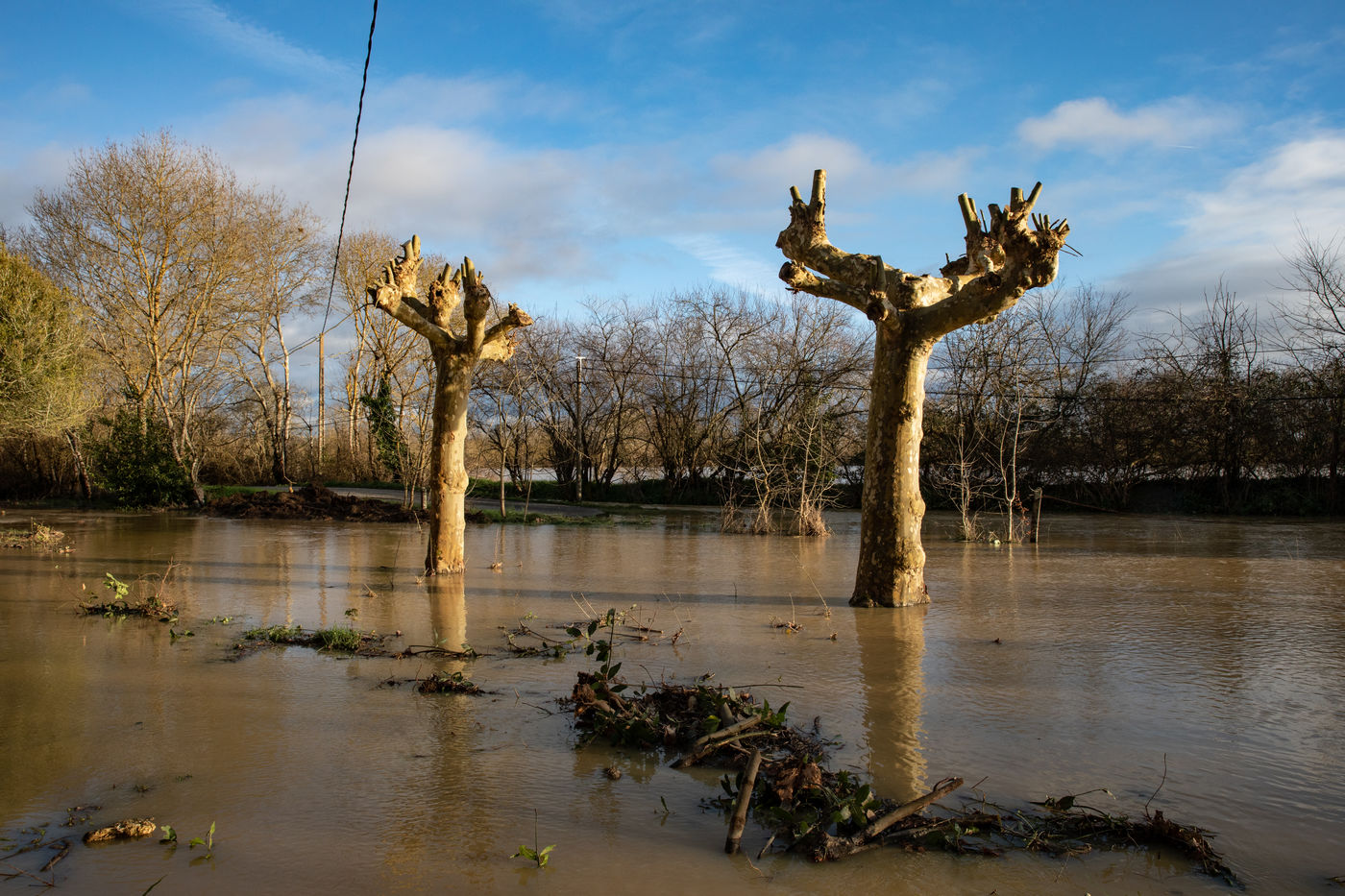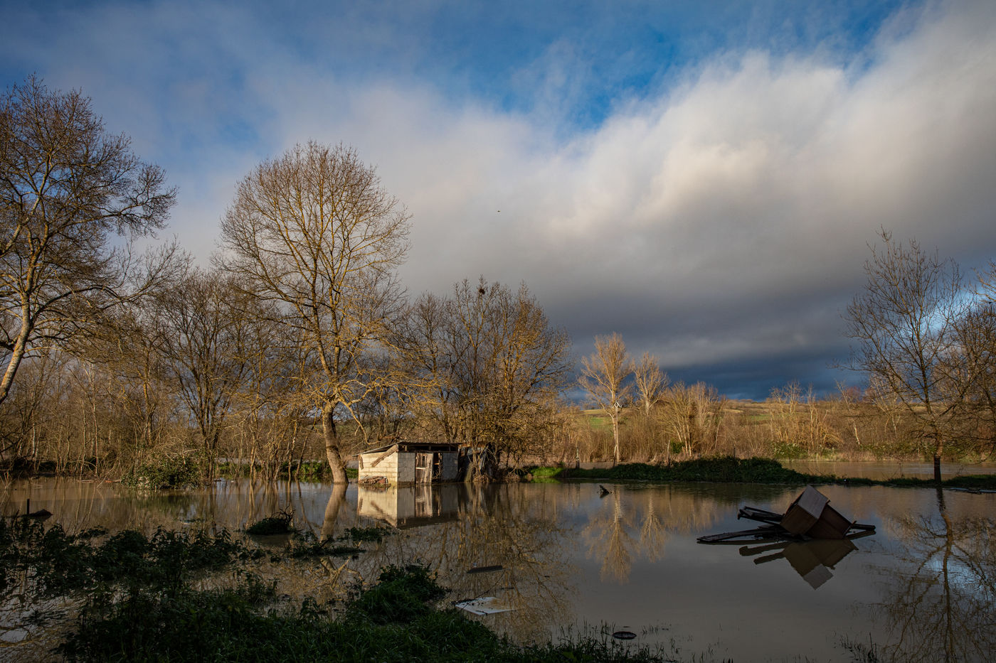 Flooded houses, overflowing rivers, roads cut off. The fields look like lakes for the enjoyment of wildlife. Birds such as egrets, for example, take advantage of this to eat the small fish that have become trapped. Many rivers have overflowed. This is also due to the very mild temperatures in the Pyrenees, which melted the snow and heavy rain at the end of the year. Today is the 3rd of January and I have taken some new photos including the Fleurance racecourse which is still well flooded. The rivers are still overflowing and there are a lot of bottles that the rivers have brought back.