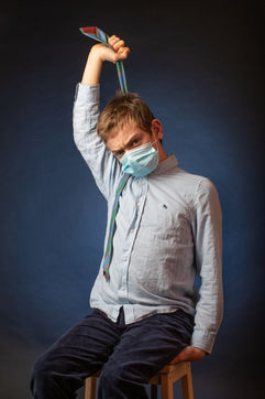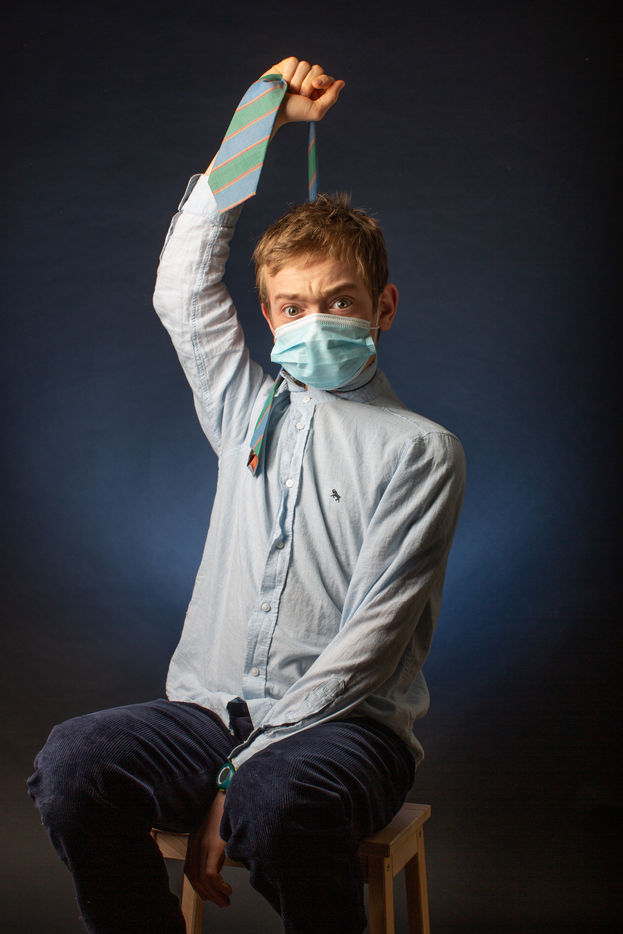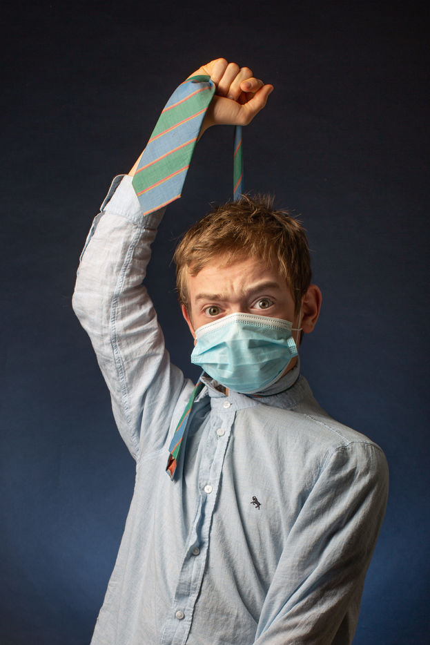 Un adolescent joue avec son masque, sa cravate, son pull.