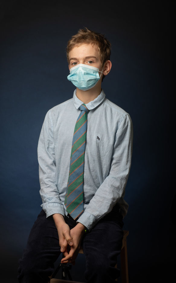 During the lockdown nothing is easy for children and teenagers. A series of images where the boy expresses several emotions with what he finds, mask, tie, jumper and a flower crown.