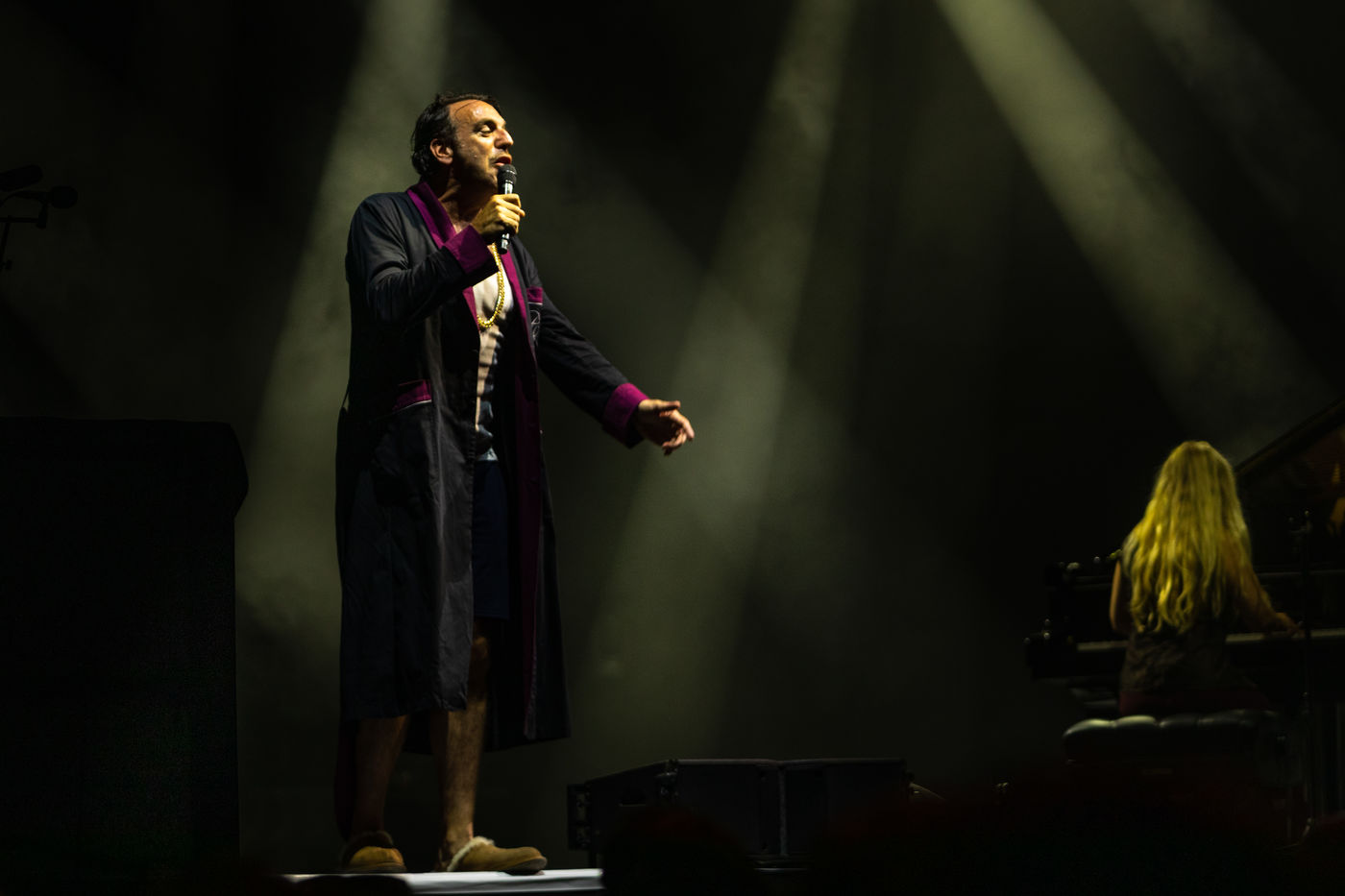 Chilly Gonzales, compositeur et pianiste canadien aux multiples talents a mis le feu ce soir-là. Vêtu de son peignoir, sa grosse chaine en or sur son marcel et ses pantoufles pianotant parfois sauvagement à son rythme à la fois endiablé et poétique, il nous a fait un superbe show digne d'un grand artiste. C'est un vrai virtuose mêlant récital de piano solo et tubes pop finissant par des rythmes de rappeur avec son fameux morceau : "wonderfoule". Vous l'aurez compris on le remercie de nous avoir tant donné. Il est drôle et talentueux, que demander de plus ? Il faut le voir et l'entendre, car c'est un vrai showman...Son bouquet final, un bain de foule, était à mourir de rire. Habitué à "surfer sur la foule" lors de ses spectacles, il a reconnu haut et fort et avec le sourire, que bien qu'adorable, son public n'en avait visiblement pas l'habitude, et qu'il avait eu quelques frayeurs. Il a également précisé que c'était un de ses concerts live favori après 2 ans de covid.