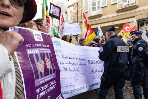 There were fewer people than on 7 March (around 480) and no elected representatives seemed to be present! Towards the end of the demonstration, a symbolic cheque for 5.5 billion euros was presented, which, according to the CGT, corresponded to the additional resources of the pension scheme if women were paid the same as men. This fictitious cheque points to the difference between men's and women's wages. It was taped to the gate of the prefecture of Auch to show that this sum would finance half of the 12 billion deficit mentioned by the government. Speeches and chants such as "Stand up for women", "Antipatriarchy" and "Revolution" were chanted by the demonstrators. Many women pensioners were present to highlight these inequalities for future generations. For decades now, women have been fighting for their rights, fighting against gender-based violence, and demanding the same salaries and yet they still have to fight for the same rights for men and women...