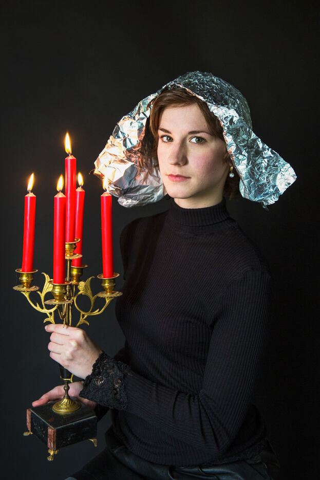 Autour de lui, les bonnets se transforment au fil de ce que l’on trouve sous la main : symboles fragiles, historiques ou contemporains. Des coiffes de lumière dans l’obscur, résistances à l’obscurantisme.