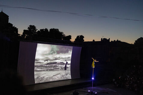 Dès les premières minutes, le public a été transporté par une performance aérienne de la compagnie Gratte Ciel. Deux funambules ont dansé dans les airs, suspendus devant un immense écran où défilaient des images. Une mise en scène spectaculaire, ponctuée de jeux d’ombres sur les photos projetées, a captivé les quelque 2 500 spectateurs, venus nombreux jusqu’aux pieds de la scène pour assister à ce moment suspendu et à la venue exceptionnelle de Nan Goldin, lauréate du prix Women in Motion 2025, qui distingue les femmes photographes.