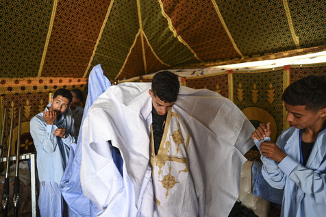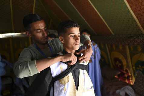 Inside a traditional Moroccan tent, the story unfolds. Tbourida uniforms are carefully laid out: draâ, trousers, belt, yellow slippers, and copies of the Quran. In this symbol-laden space, young riders help one another dress and prepare, performing a collective ritual that reinforces discipline and solidarity. At the heart of this preparation stands El Aaida Hassan, a young Moqaddem from the Guelmim-Oued Noun region, responsible for leading his Sorba with rhythm, visual harmony, and moral authority.