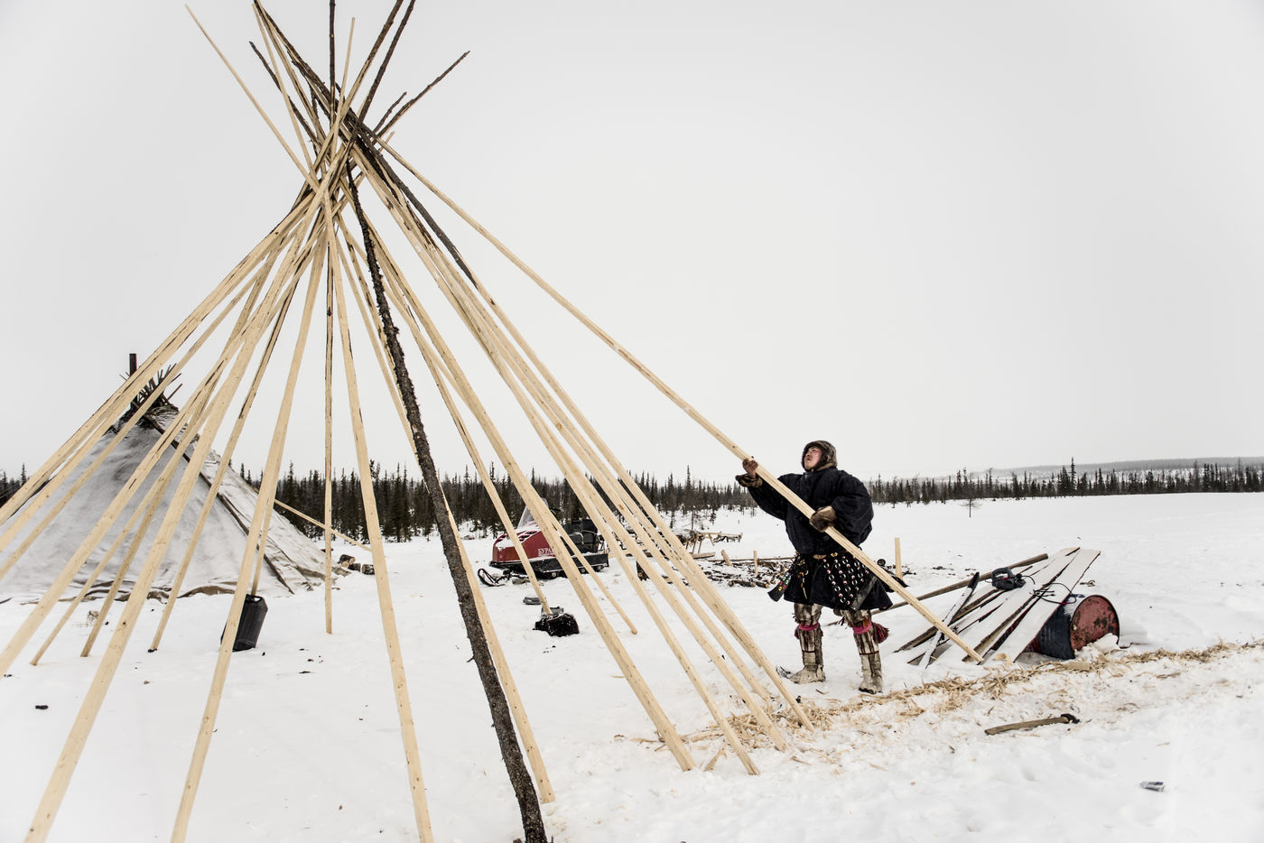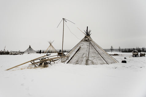 Il est important de pouvoir monté le camp rapidement en cas de tempête. La structure des tchoums se doit d'être légères et facilement transportables. Elle demande une vingtaine de troncs de conifères et une centaine de peaux de rennes. Cette simple structure, recouverte de son manteau et le lieu de vie principal des Nenets de Sibérie Occidentale.