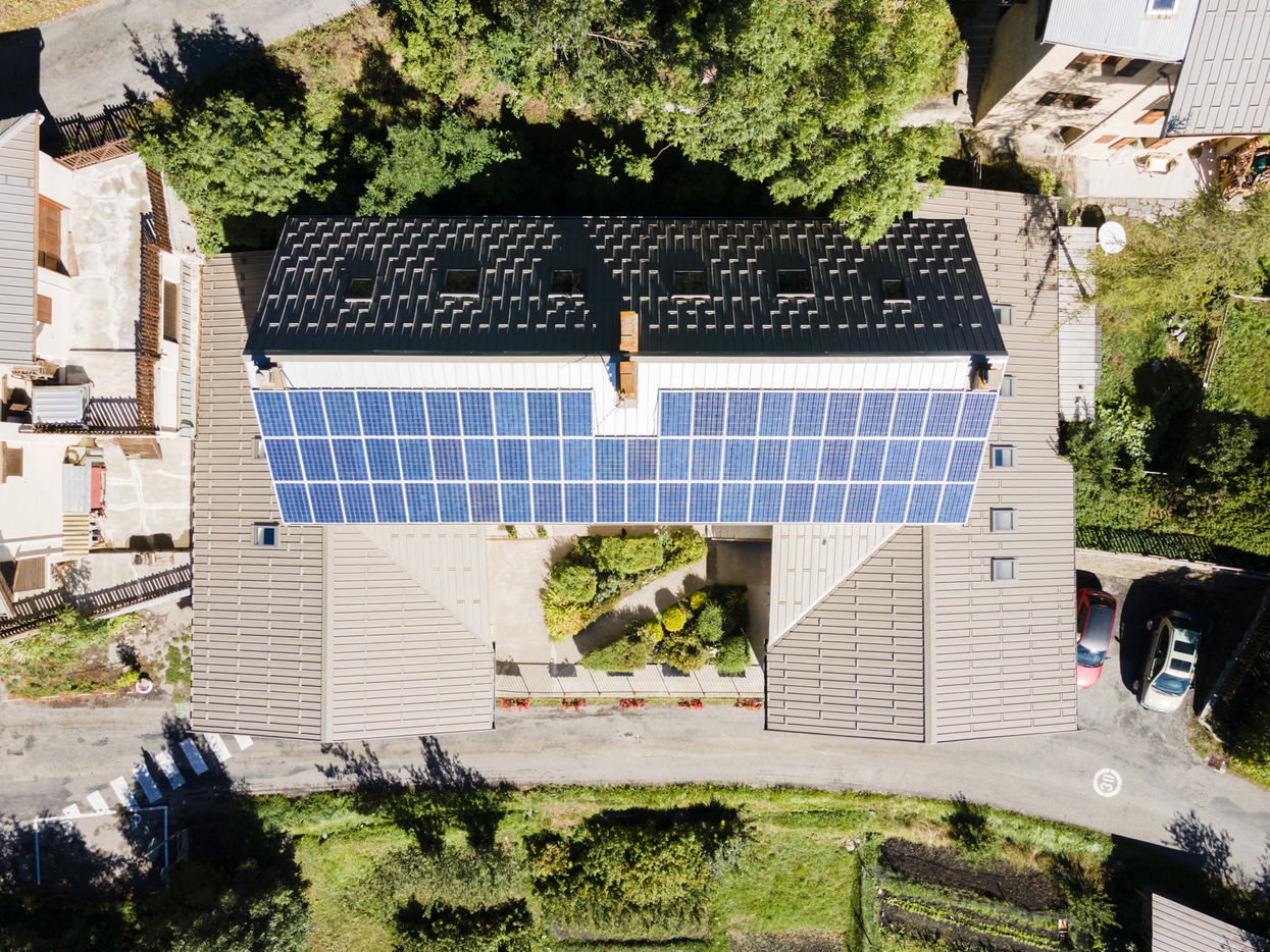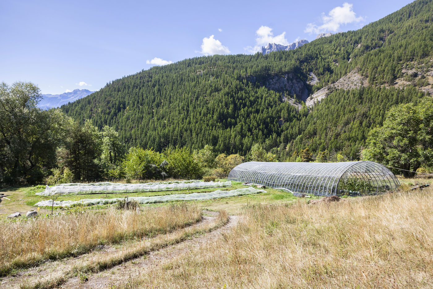 Puy-Saint-André, septembre 2021. Village écologique modèle des Hautes-Alpes, Puy-Saint-André prépare sa résilience aux chocs climatiques : centrales photovoltaïques et solaires thermiques, isolation des bâtiments municipaux, construction de bâtiments économes en énergie, installation d'un vacher, d'une chèvrerie et de serres pour accroître l'autonomie alimentaire, vergers collectifs, navette les jours de marché, participation citoyenne generalisée.