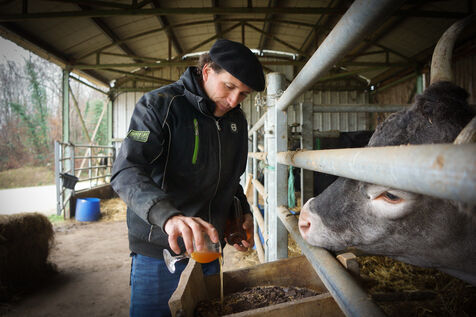 On their return to Auros, the heifers go to breeding, and the steers return to the cowshed for fattening. "Finishing lasts ten months for the Bazadaises and 18 months for the Wagyus," explains Pierre-Julien, who, on becoming a cattle breeder, discovered a passion for feeding and fattening his animals. "I designed a basic nutrition program with the help of a nutritionist, then developed it further as I met Wagyus breeders. Like athletes and pastry chefs, I attach great importance to a rigorous diet. A measure is a measure. We weigh all the ingredients in the ration to obtain a precise daily ration, distributed to the exact measure. Excellence is a set of details that are not necessarily visible at first glance.? As a result, the beef cattle's daily portion will gradually increase from 100% Mayenne grass to 100% Gironde cereals.
