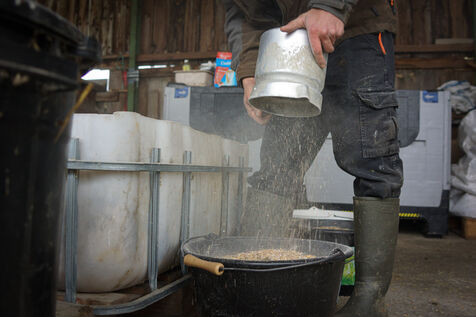 À leur retour à Auros, les génisses vont à la reproduction, et les boeufs retrouvent l'étable pour y être engraissés. « La finition dure dix mois pour les Bazadaises et 18 mois pour les Wagyus », précise Pierre-Julien qui, en devenant éleveur bovin, s?est découvert une passion pour l'alimentation et l'engraissement de ses animaux. « J'ai conçu une base de nutrition avec l'aide d'une nutritionniste, puis je l?ai faite évoluer au fil de mes rencontres avec des éleveurs de Wagyus. J'apporte beaucoup d'importance à la rigueur alimentaire, comme les athlètes ou les pâtissiers. Une mesure est une mesure. Nous pesons tous les ingrédients de la ration pour obtenir une ration quotidienne précise, distribuée à la mesure près. L'excellence est un ensemble de détails qui ne se voient pas forcément au premier coup d'oeil. » La portion journalière des boeufs va ainsi augmenter progressivement pour passer du 100 % herbe Mayennaise aux 100 % céréales Girondines.