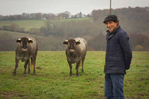 In Auros, Gironde, Pierre-Julien Allard takes great care of his herd of Bazadaise cattle. Raised like a grand cru, the steers and heifers gorge themselves on meticulously prepared cereal rations and drink two glasses of Sauternes must a day.