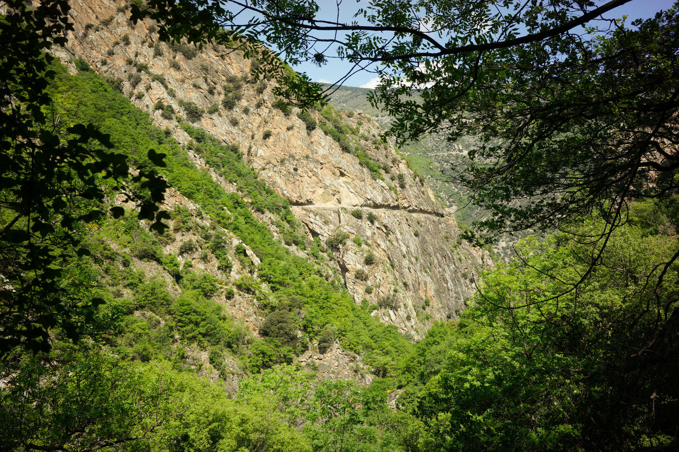 Creusée en 1943 pour permettre l’accès au chantier de captage des eaux destiné à l’usine hydroélectrique de Thuès, la corniche historique témoigne de l’ingéniosité humaine dans un environnement extrême. Aujourd’hui, elle sert d’accès à un canyon profond, creusé dans la roche, où s’épanouit une végétation luxuriante, presque tropicale, contrastant avec la rudesse du minéral.