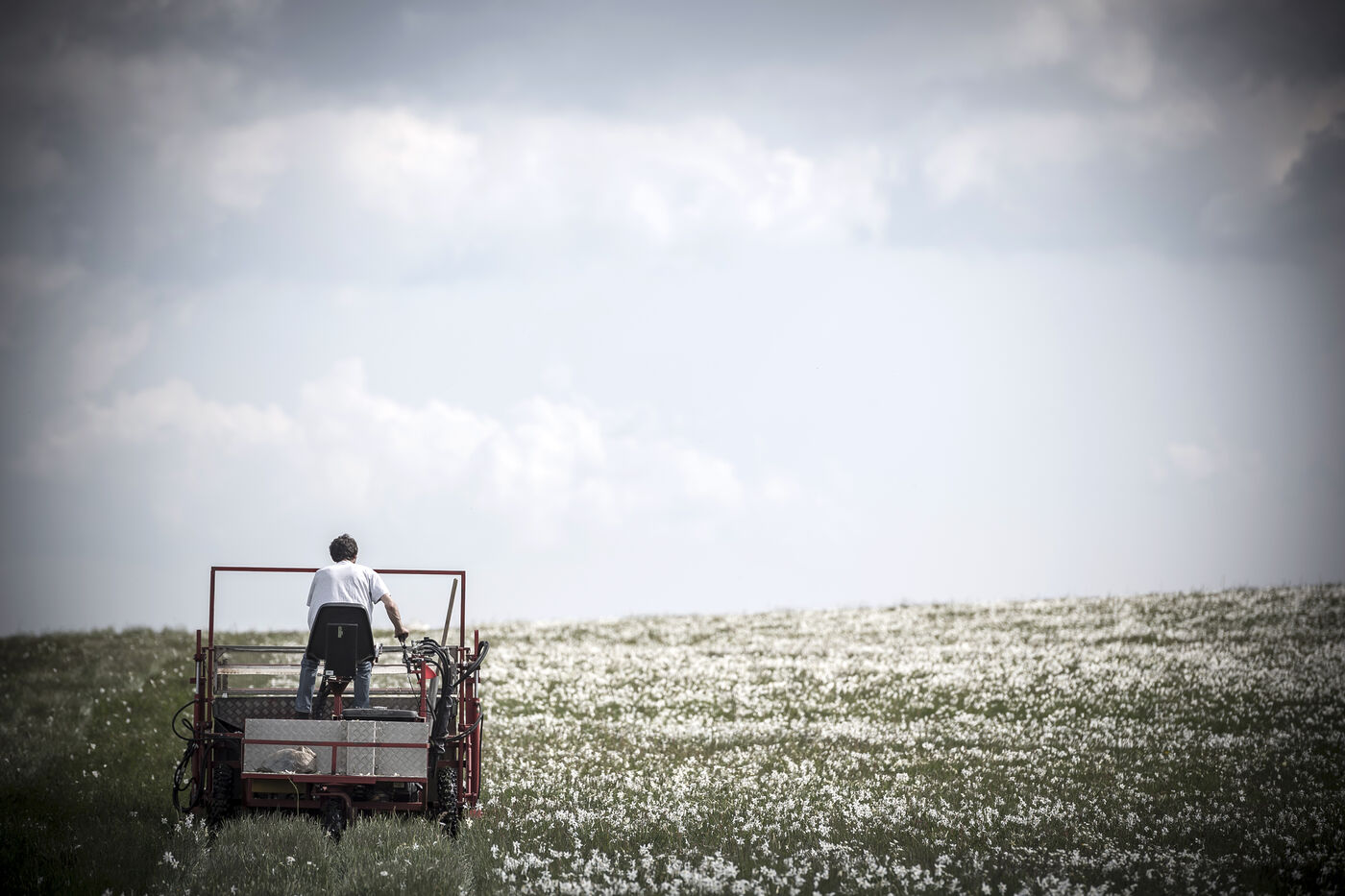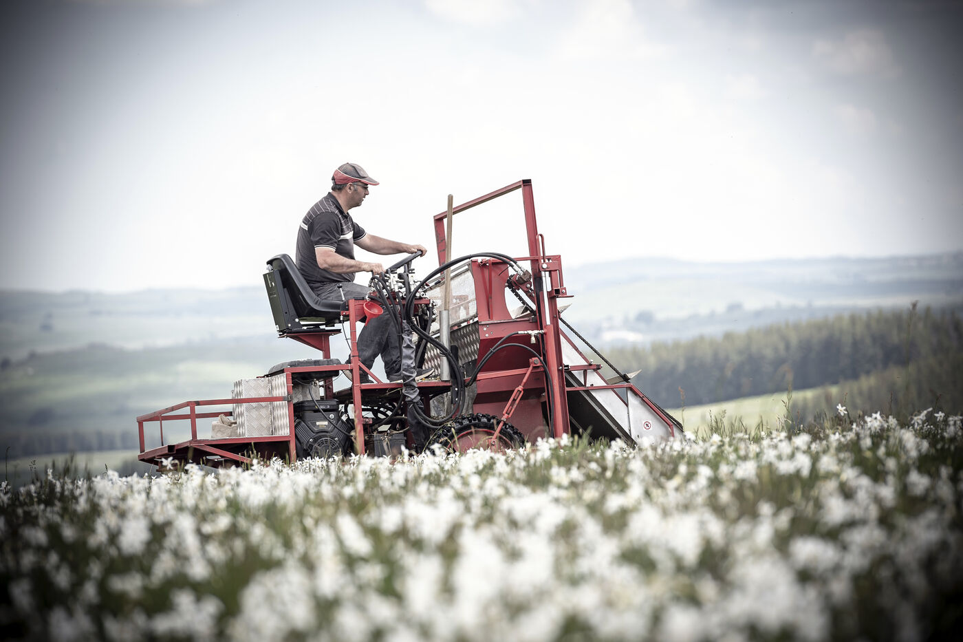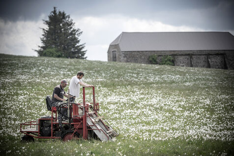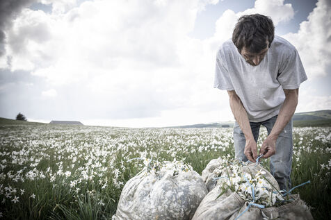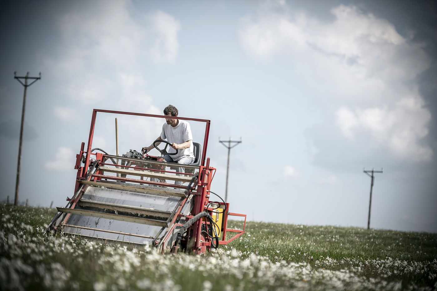 Mechanical harvesting of narcissus flowers in Aubrac. After processing, they will be used by the perfume industry.