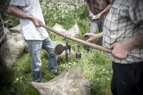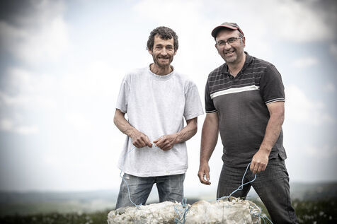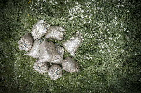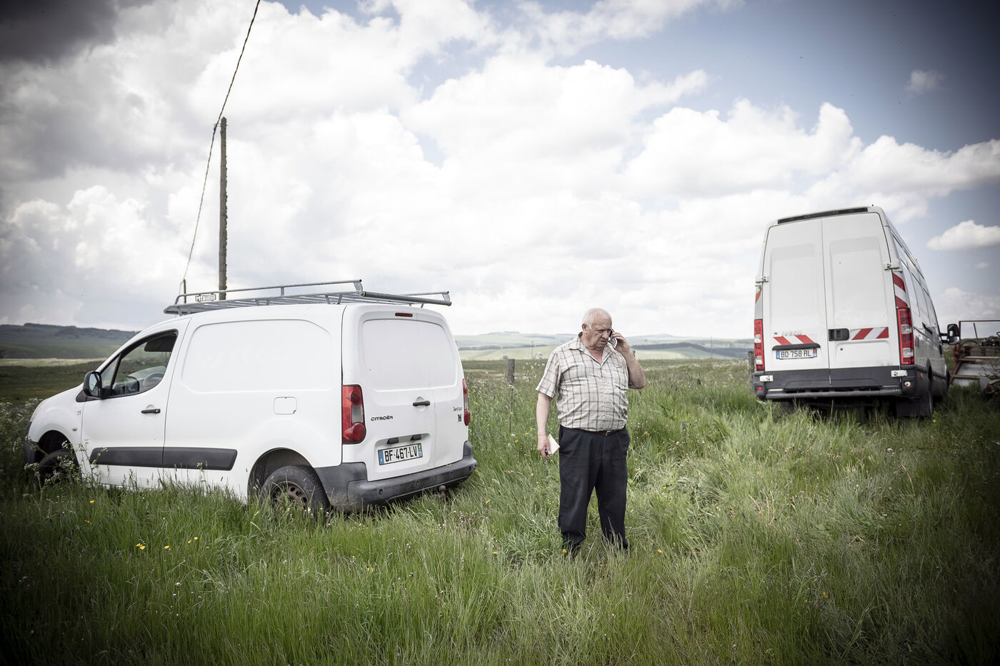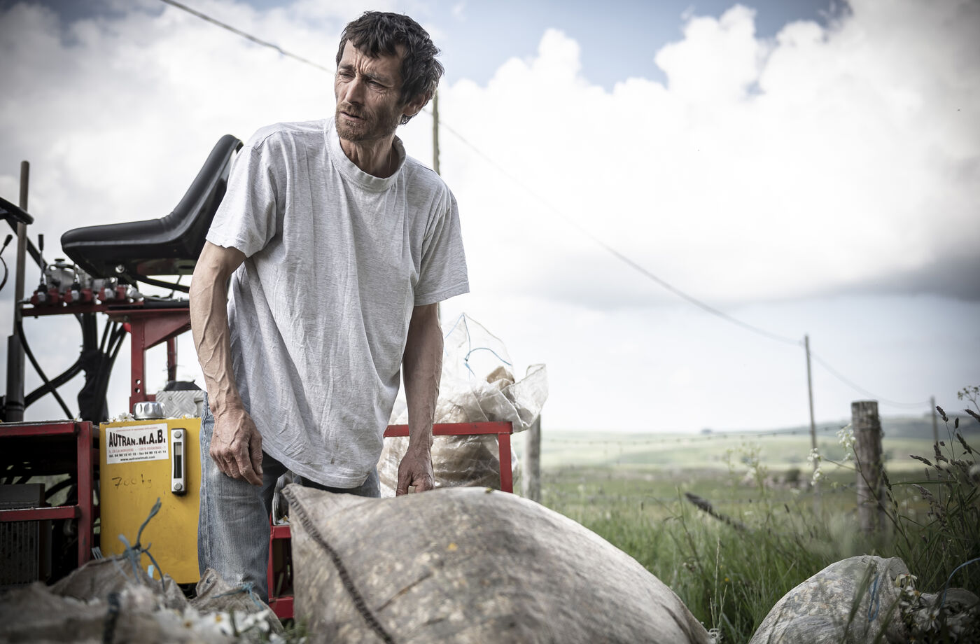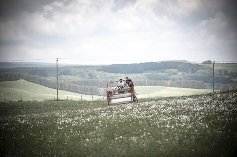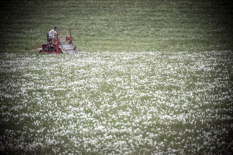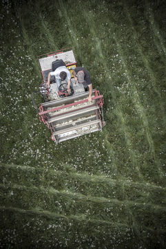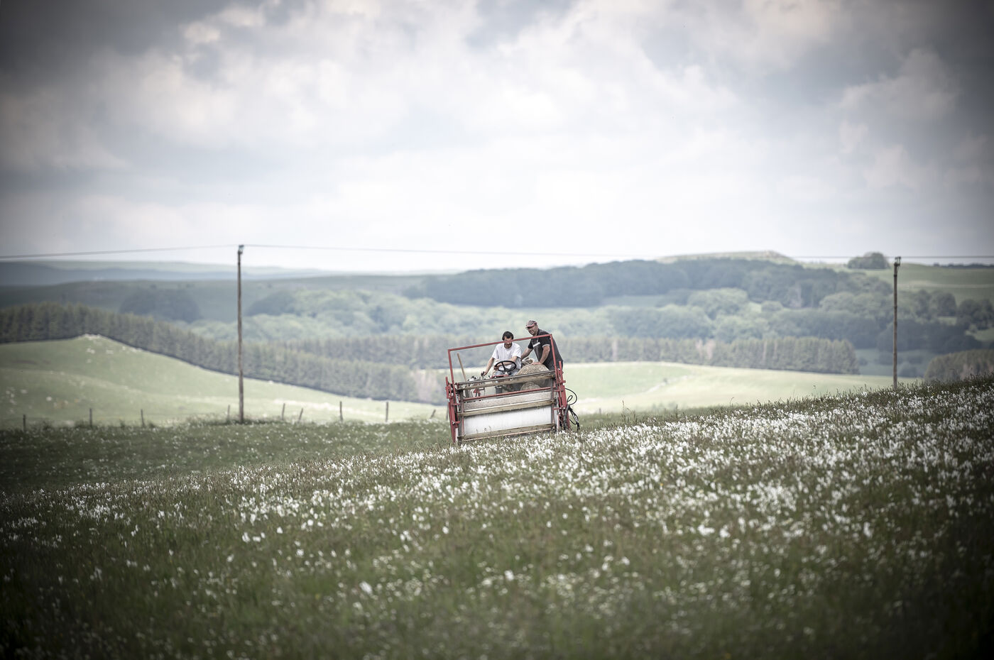 Mechanical harvesting of narcissus flowers in Aubrac. After processing, they will be used by the perfume industry.
