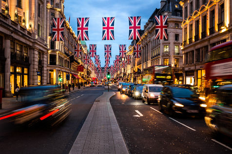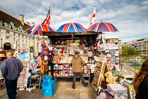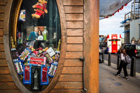 Drapeaux du Royaume Uni dans les rues, décoration de vitrines, vente de goodies, d'assiettes en porcelaine à l'effigie des futurs mariés, illustration d'une ville qui se prépare à son évènement royal.
