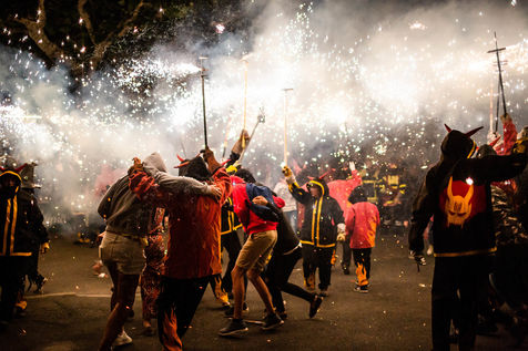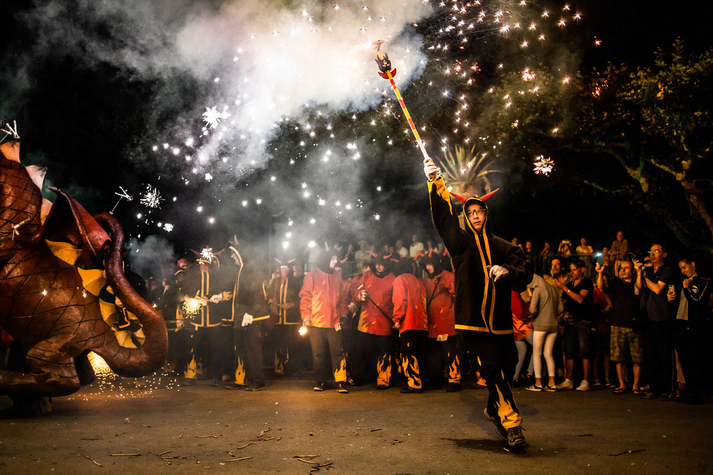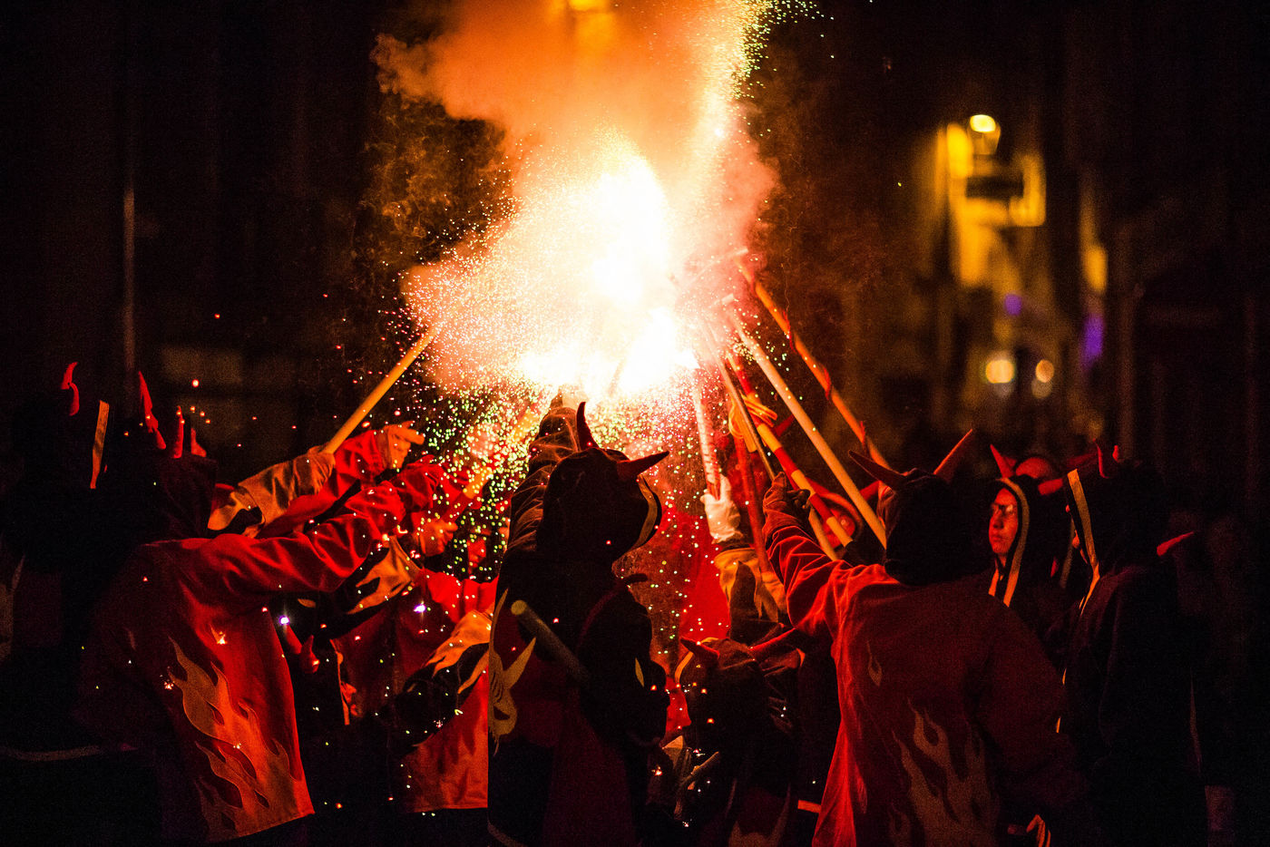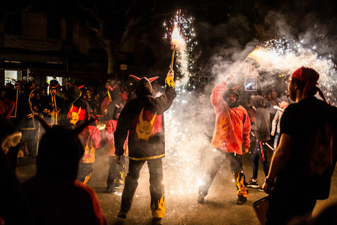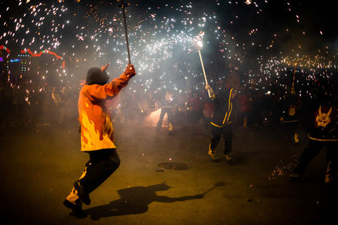 The Correfocs (running fires) are part of traditional Catalan folk festivals. During their performance, devils' glues dance with fireworks on a spade to the rhythms of the percussion groups accompanying them. Here, the Nyerros of the Conflent, in Prades for the Feast of Saint Peter.