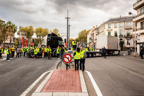 Illustrations de manifestations et blocages du mouvement des Gilets Jaunes, le 17 novembre 2018, à Perpignan centre ville et entrée d'autoroute.