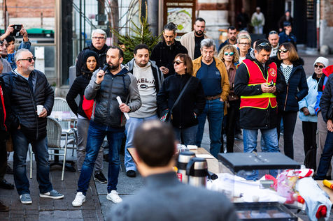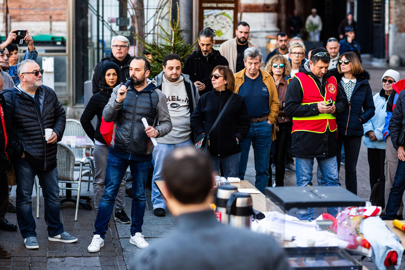 Organisation d'une assemblee générale de Cheminots, sur la place, suivi d'un repas buffet revendicatif.